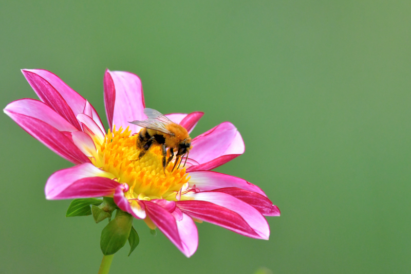 トラマルハナバチ作品もバックが抜けて、鮮やかな黄色とピンクのダリアの花の蜜を吸っている所を捉え、とても鮮やかで明るい作品です。