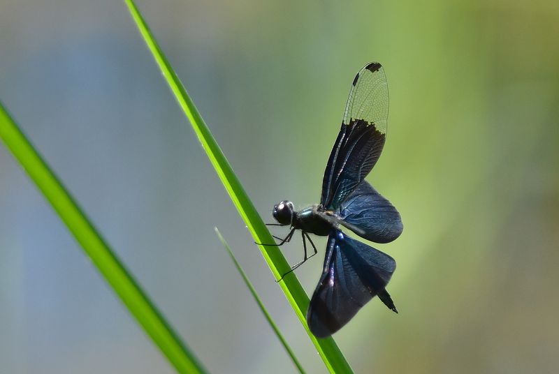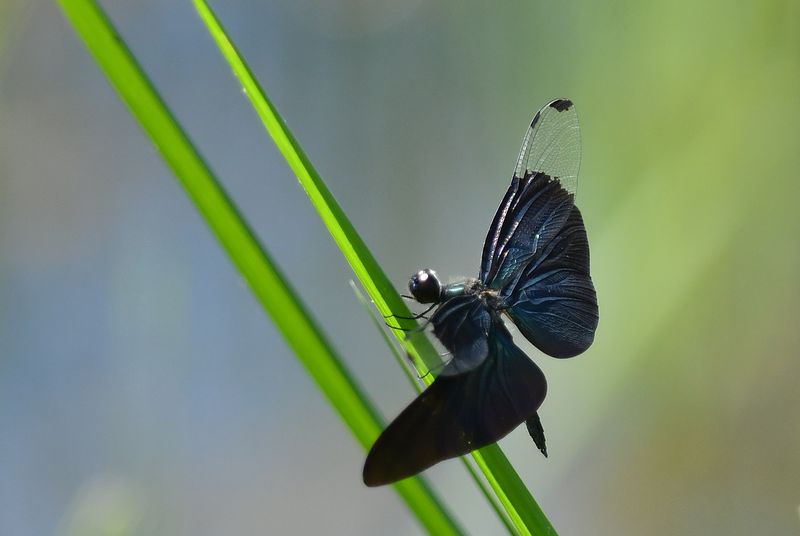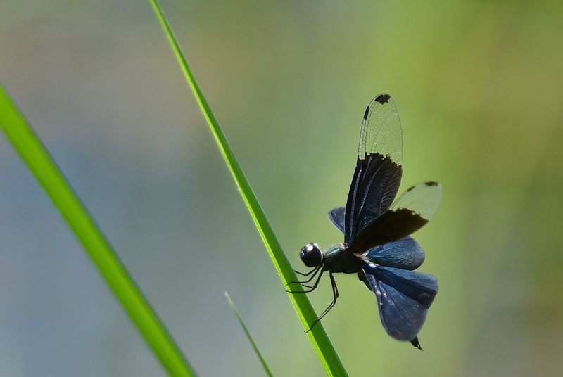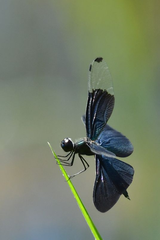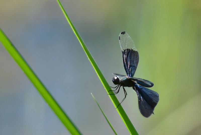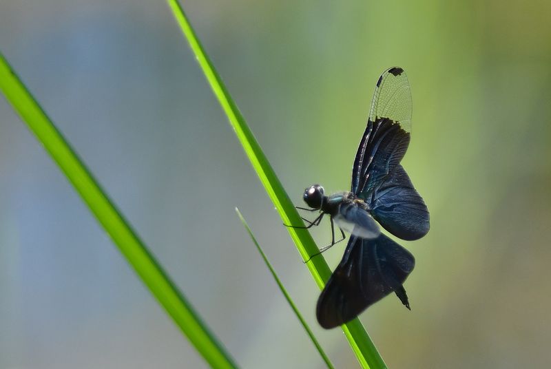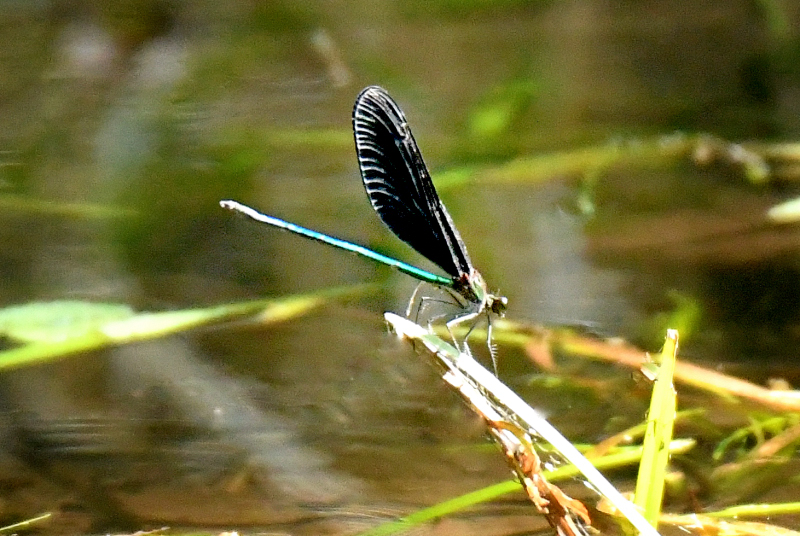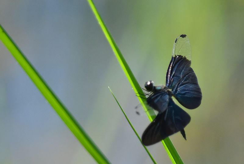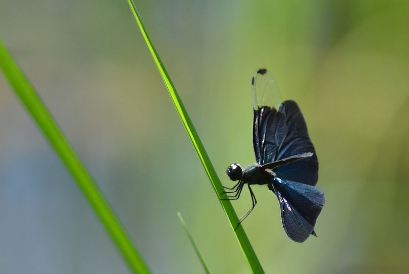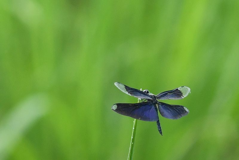 ハグロトンボ作品は、緑の尾が綺麗で、黒い羽が引き立っています。