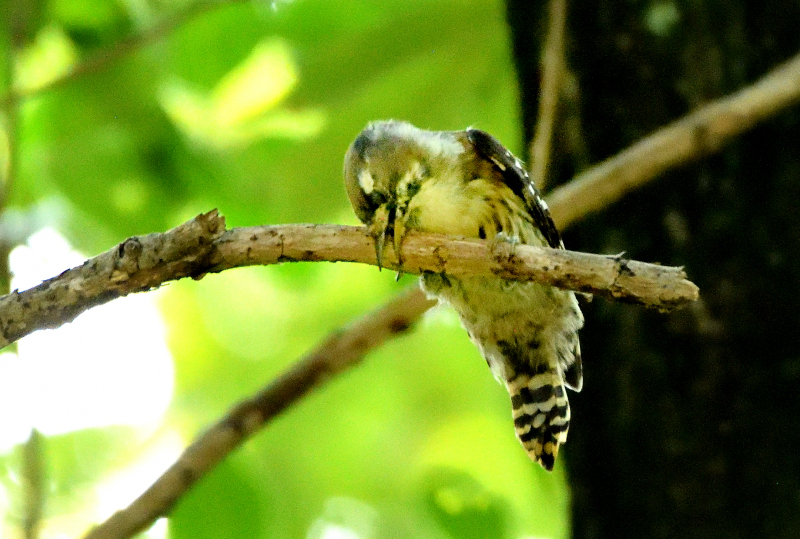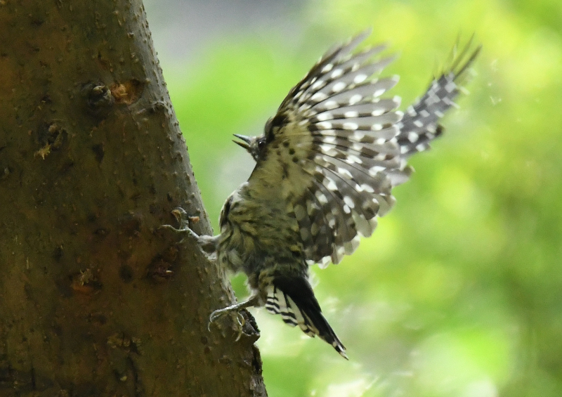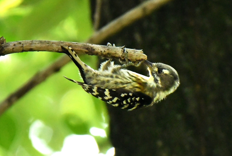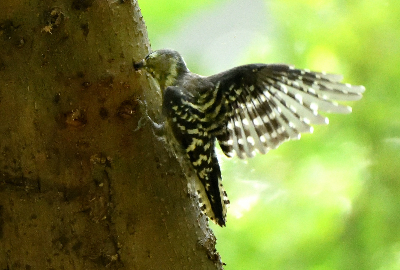 2番目の作品も、幹に穴をあけている所を捉え、こちらもバックが抜けて、羽に光が当たって綺麗で、やはり躍動感があります。