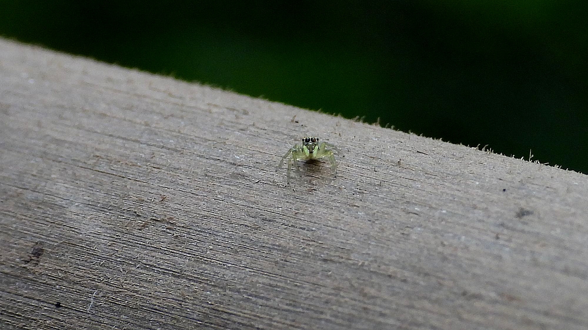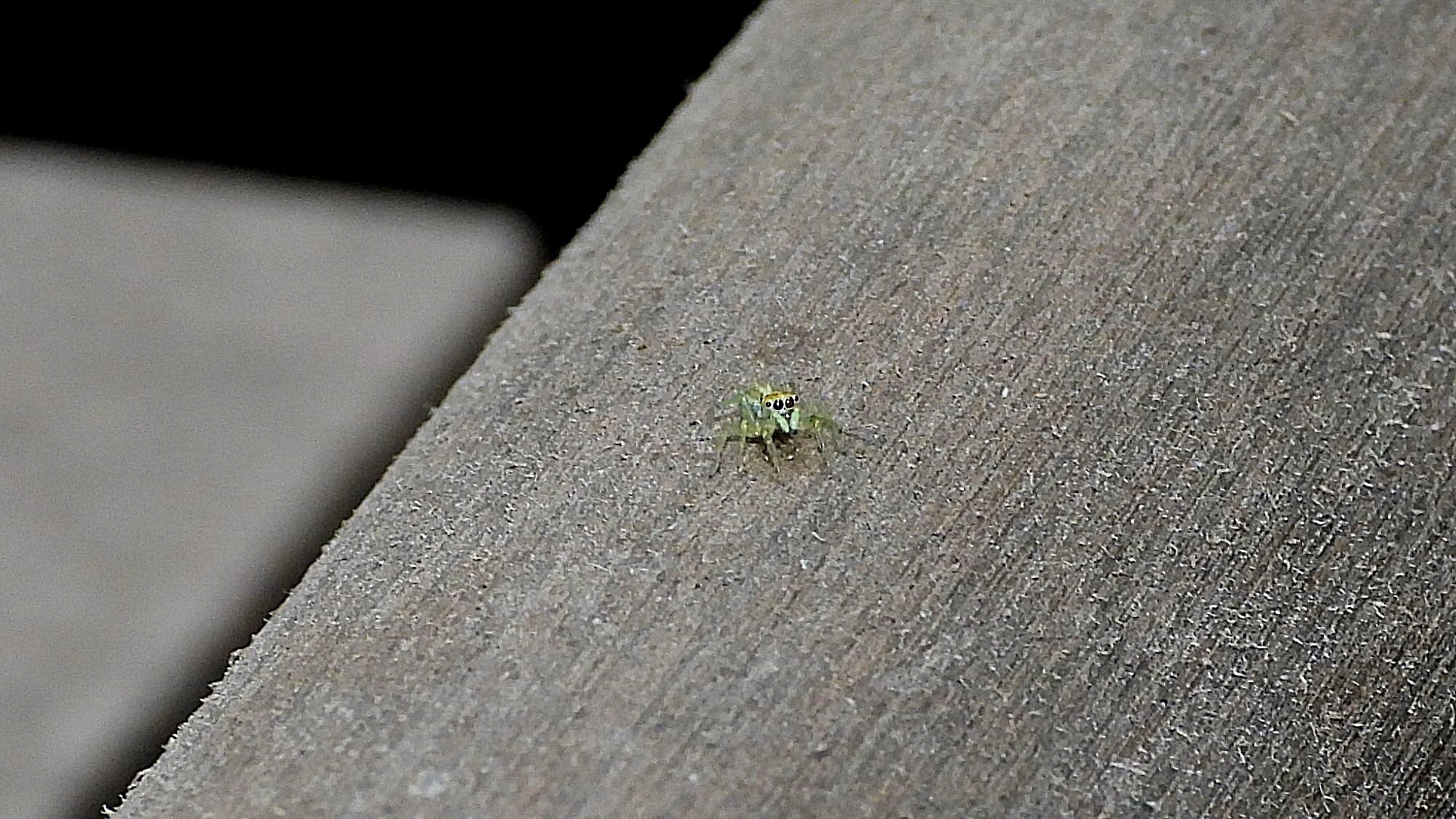 名前のわからない小さな緑色のハエトリ(Google lensによればメガネアサヒハエトリ)