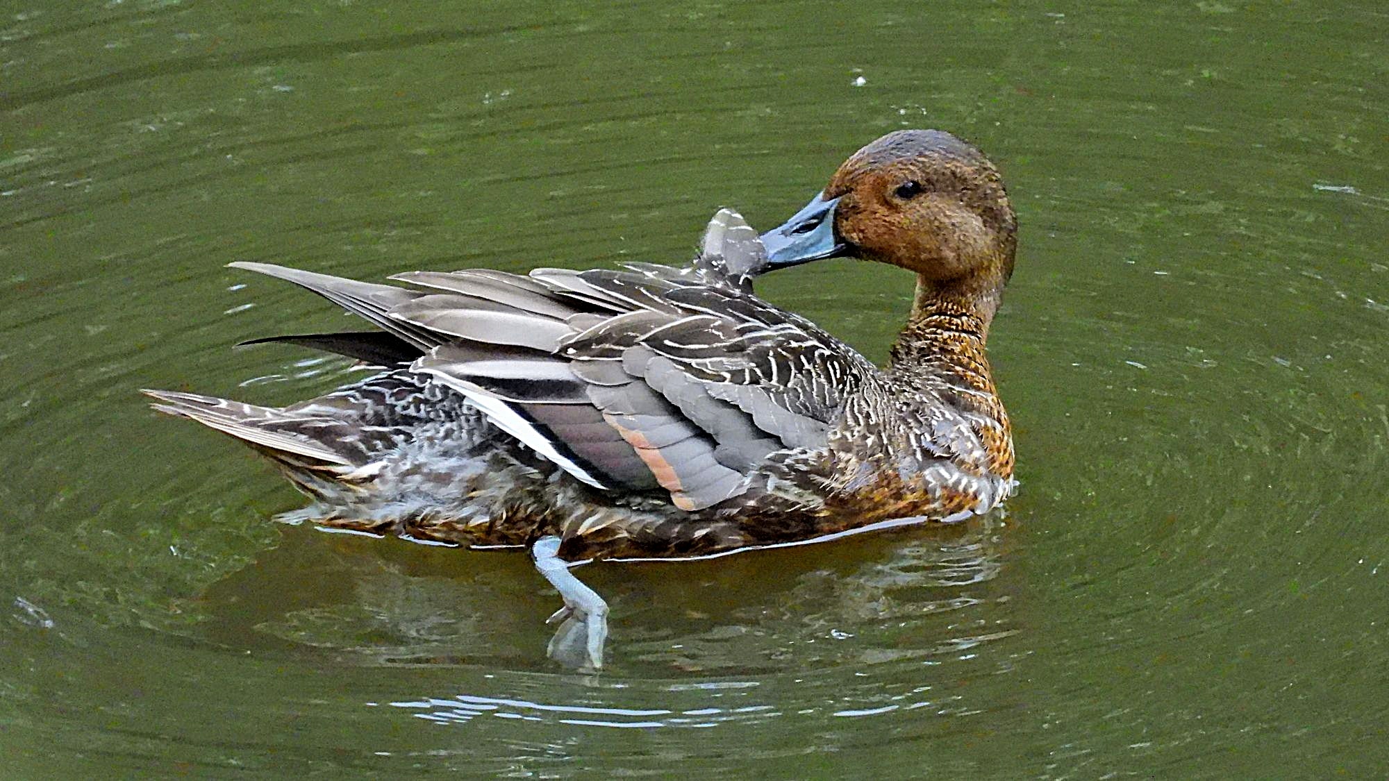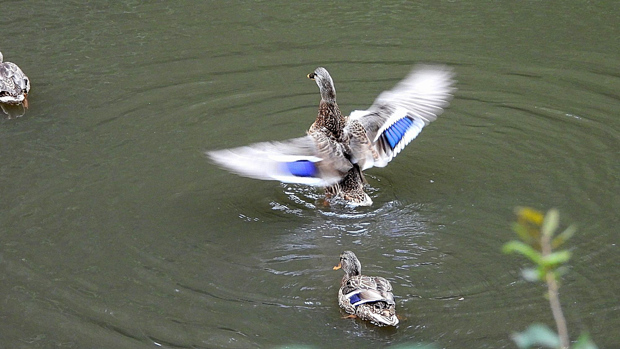 マガモの後ろ姿作品は、羽ばたきした所を捉え、羽がブレて躍動感があります。