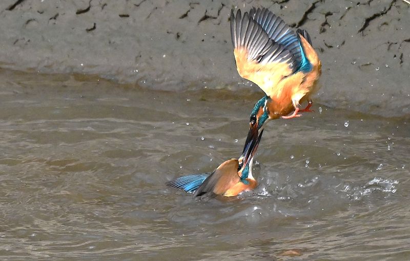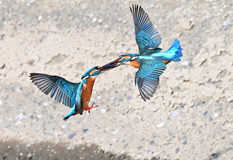 カワセミ雄2羽のバトル作品は、空中と水面で嘴をお互いに絡ませて激しい場面を鮮明に撮られ、目にしっかり光が入って、発色がとても鮮やかで躍動感があります。