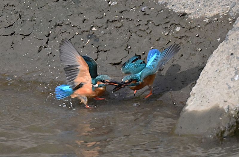 上流と下流のカワセミが接近して縄張り争いを始めました。