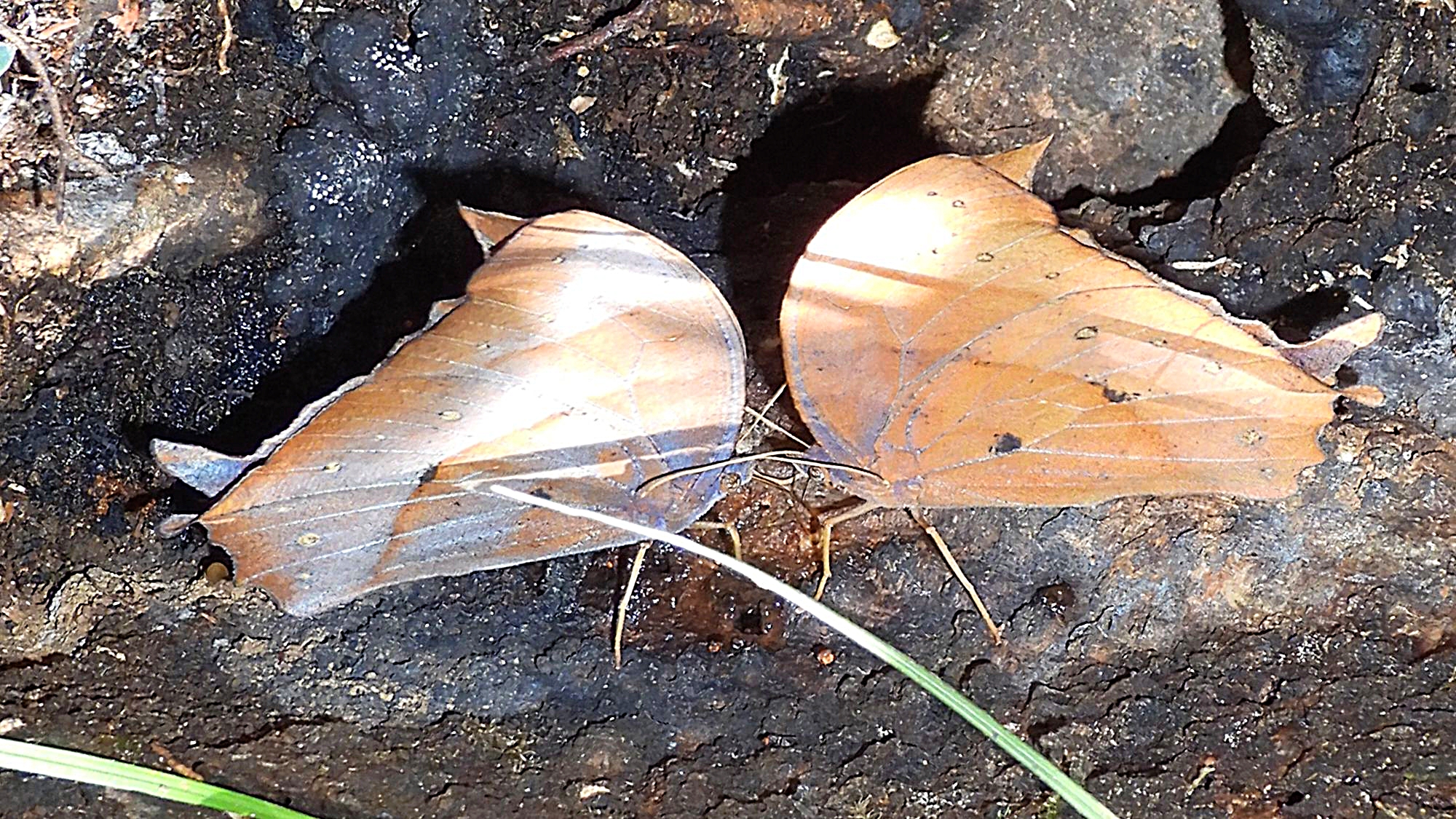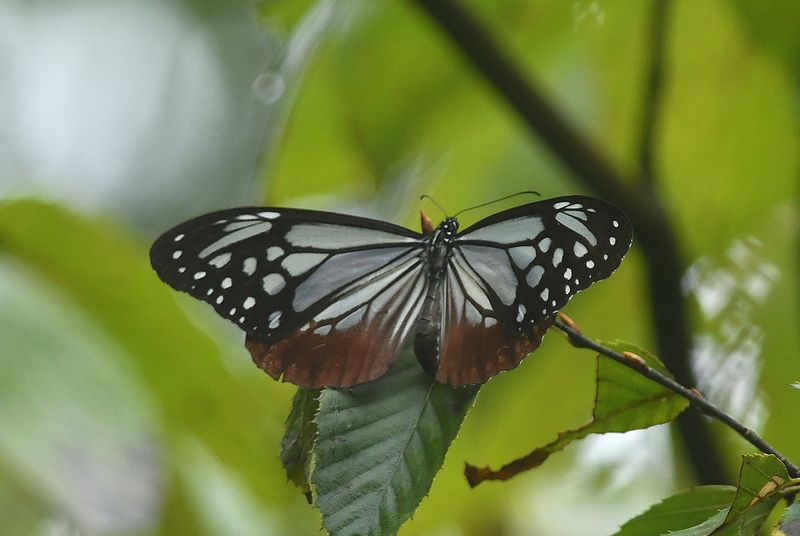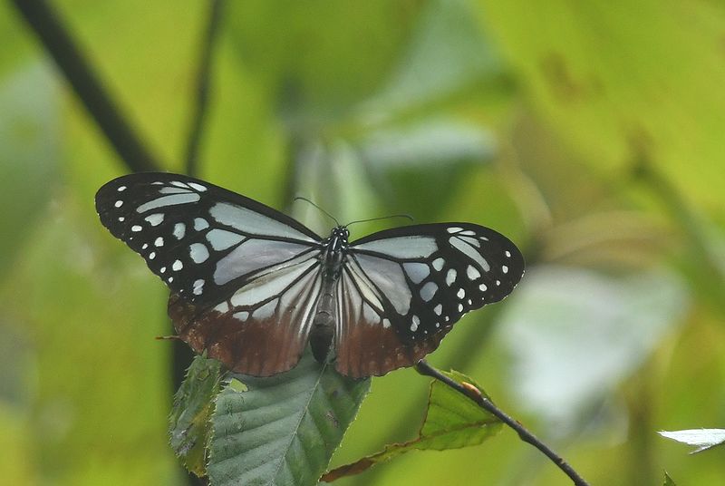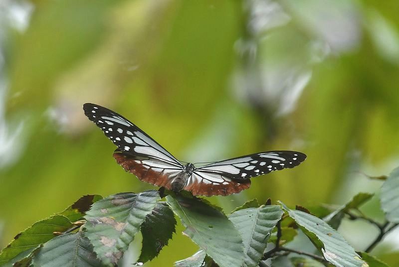 園内を歩いていたらアサギマダラが飛来し、慌てて機材を持ち出している間に行方不明になり、雨が降る中約30分待機したら、姿を見せ、木の高い所に止まってから林内に飛び去りました。