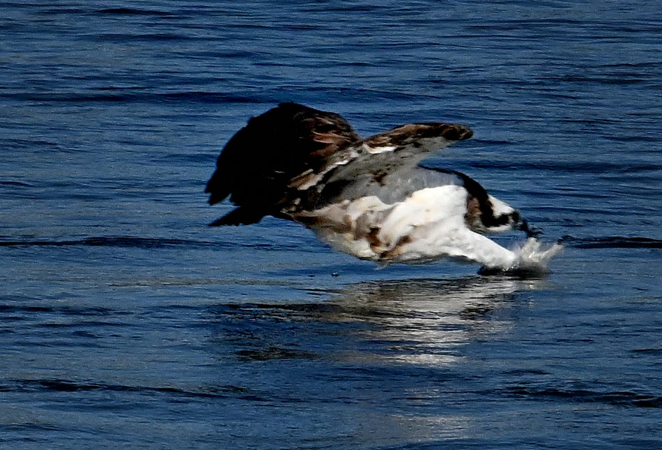 水面からの飛び出しの連続作品は、こちらも青い水面バックにミサゴが飛翔している場面は、開いた羽が綺麗で躍動感があります。