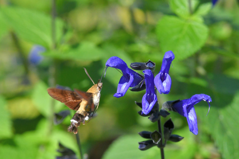 ヒメクロホウジャク作品は、青い花の蜜を吸いに飛来した所を捉え、動きの速い蛾がホバーリングして、羽がブレて躍動感があります。