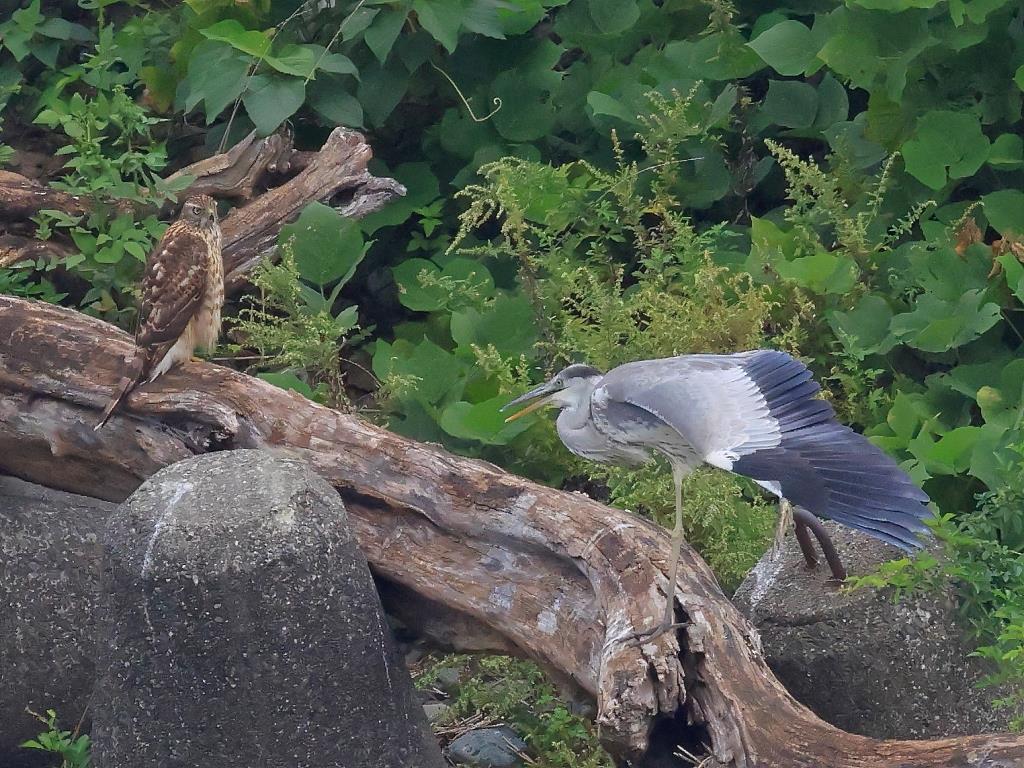 オオタカ若作品は、約150m先のオオタカ若とアオサギが倒木に止まっている場面は、アオサギが羽を開いた所をオオタカ若が見つめている光景は微笑ましいです。