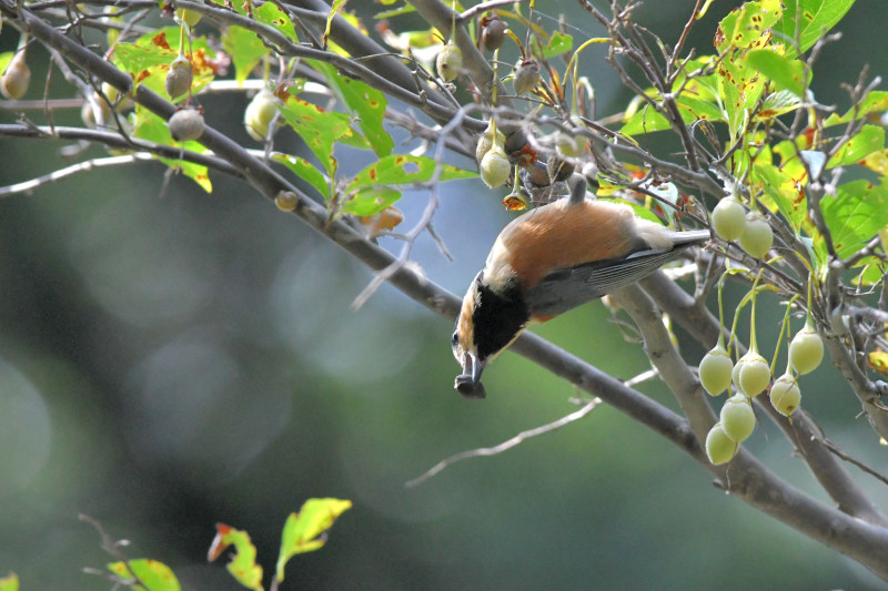 ヤマガラ作品は、エゴノキの枝に逆さまになりながらエゴの実を咥えた所を捉え、秋らしい作品です。