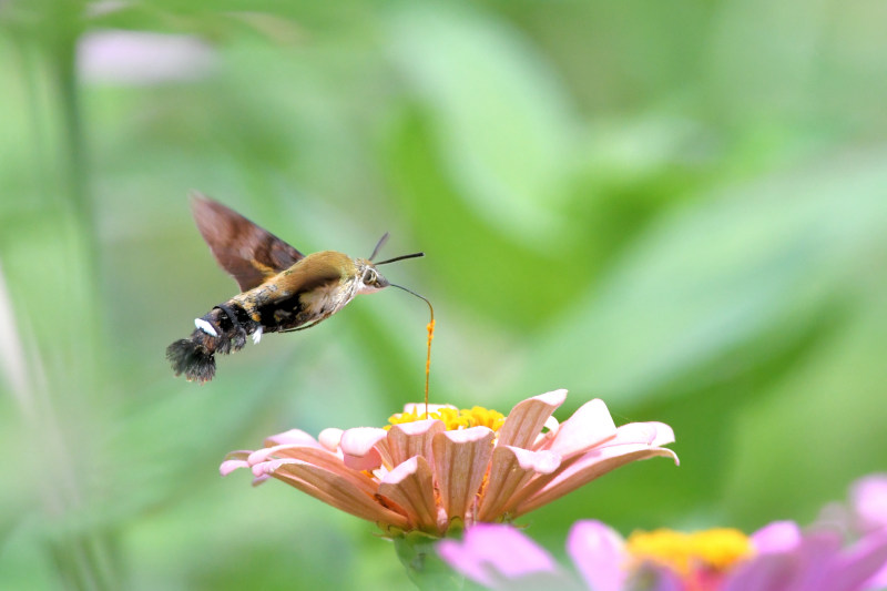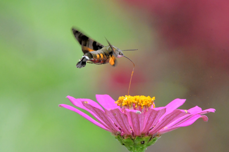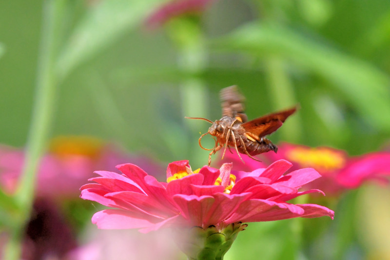ホウジャク3種作品は、百日草の花の蜜を吸いに飛来した所を捉え、蜜を吸っている所を鮮明に撮られ、百日草の花がカラフルで、ホウジャク3種の飛翔場面の羽がブレて躍動感があって、バックが抜けて引き立っています。