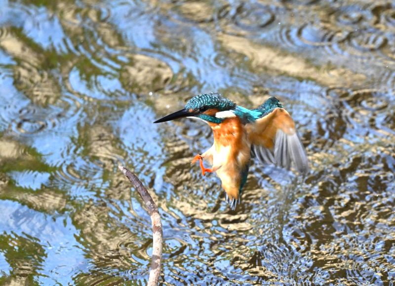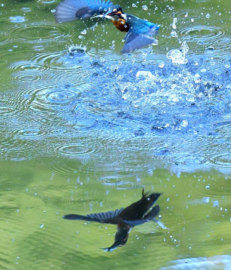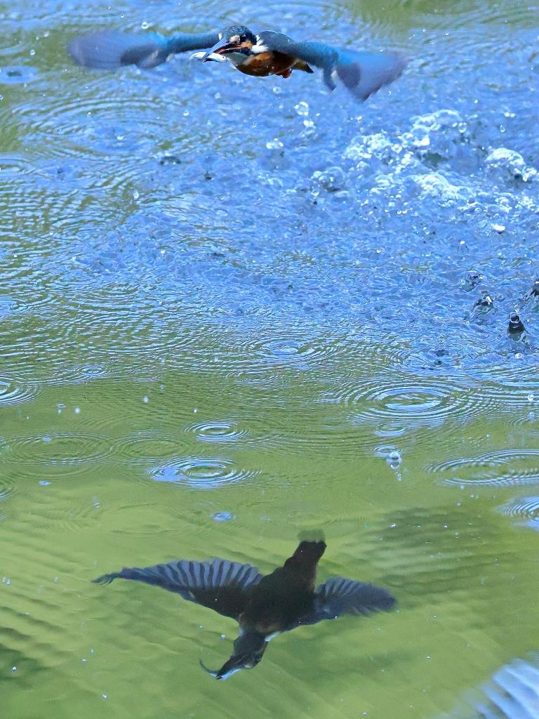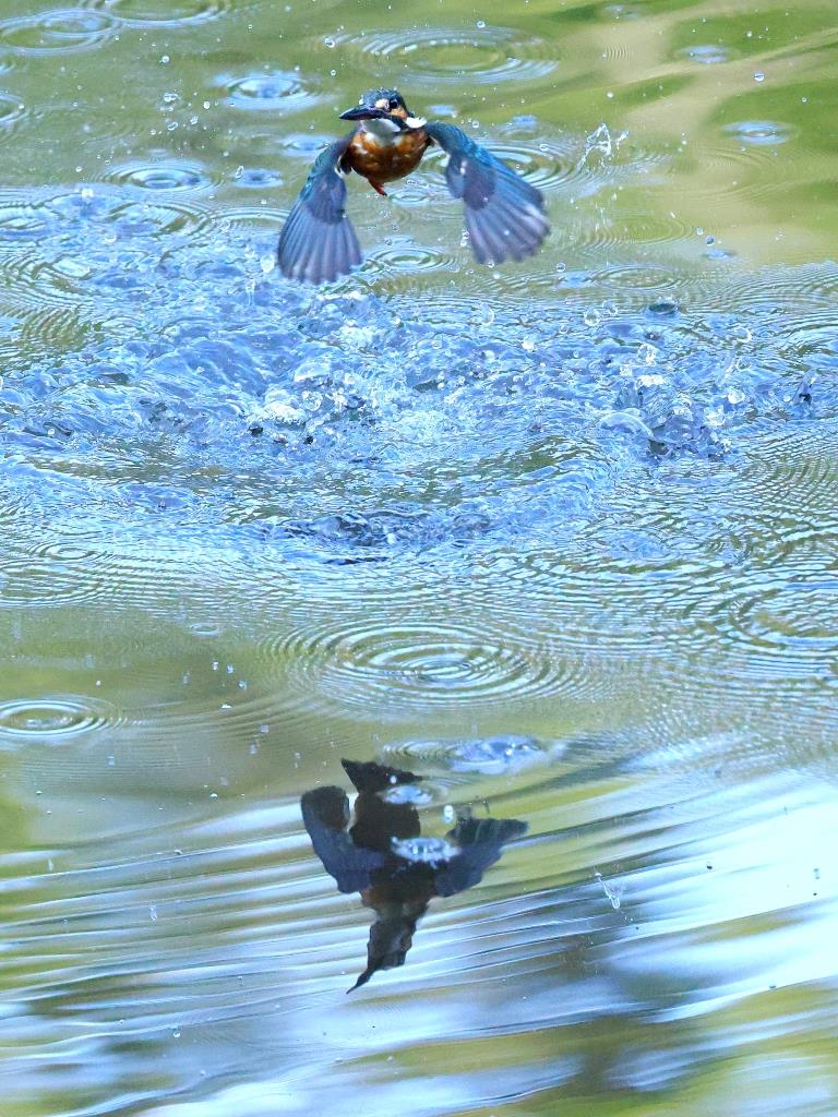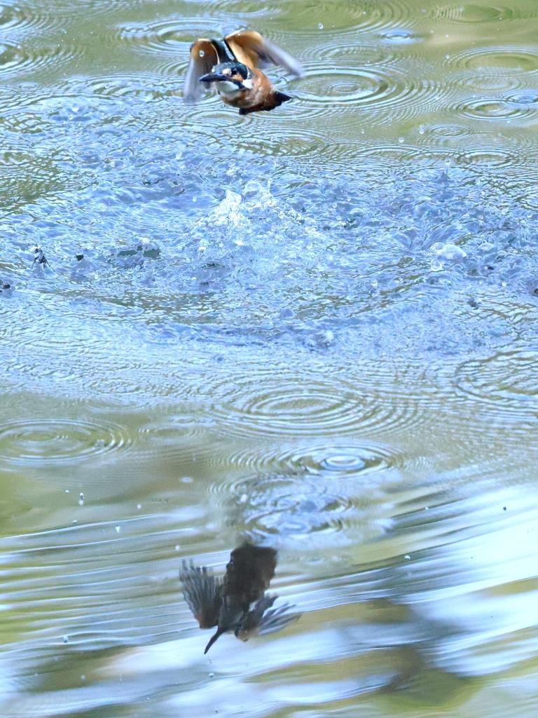 カワセミの他、シラサギとアオサギが萩の花の中にずっとおり、それはそれで楽しめました。カワセミの2回のダイブからの飛びあがりのリフレクションが撮れたのでアップです(画像は悪いですが)。
