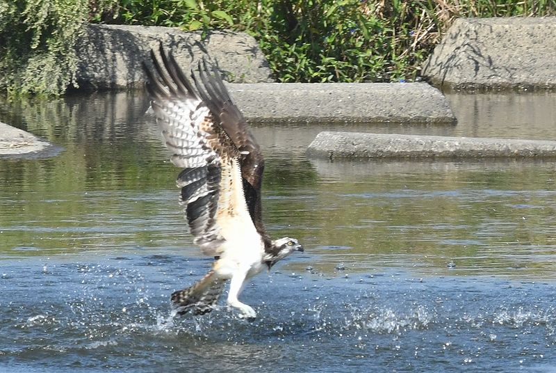 相模川両岸の田圃の稲刈りが始まって、25日頃から農業用水を止めて堰の水位を一番低くしたことによって、堰の上流に中州が広がり、ミサゴの飛び込む場所が分散してしまったようです。