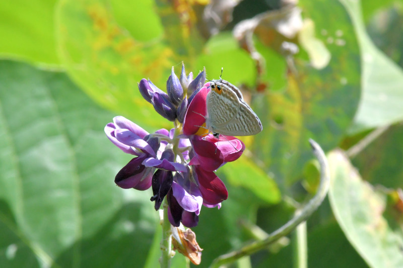 ウラナミシジミ作品は,クズの花の蜜を吸いに飛来した所を捉え、綺麗な花で蝶が目立たない位ですが、鮮明に撮られ流石です。