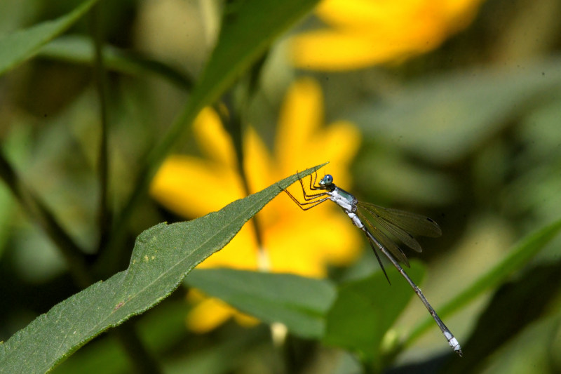 アオイトトンボ作品は、黄色い花バックの草に止まった所を捉え、とても鮮明に撮られ引き立っています。