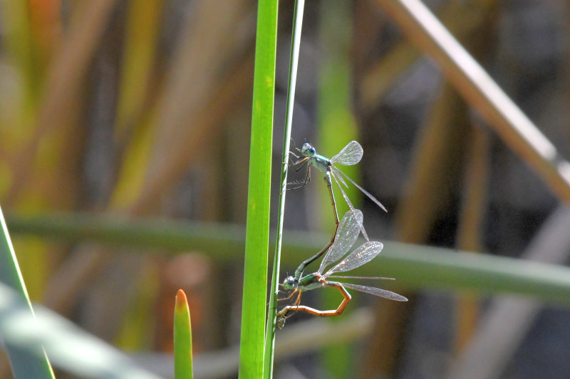 アオイトトンボペア作品は、草に止まった所を捉え、羽が光ってバックが抜けてペアが引き立っています。