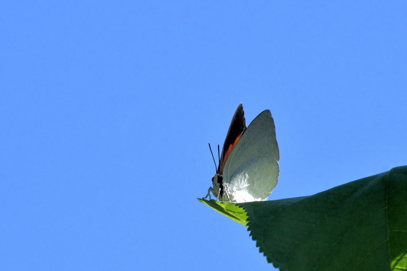 ウラギンシジミ作品は、青空バックの葉に止まった所を捉え、こちらも蝶が引き立っています。