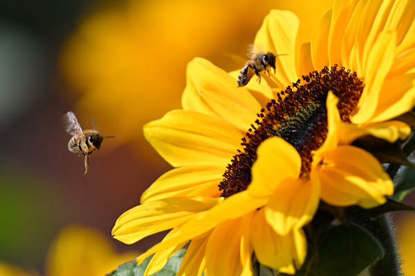 花の蜜を吸いに飛来したミツバチは小さいにも拘らず、飛翔場面をしっかり撮られ、まっ黄色の向日葵が鮮やかです。