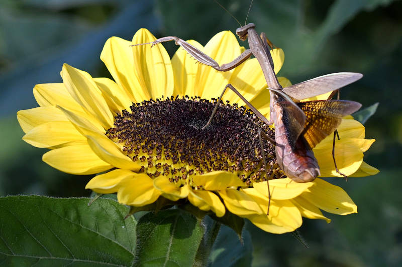 カマキリが向日葵の花に乗っている所を捉え、ナイスショットです。