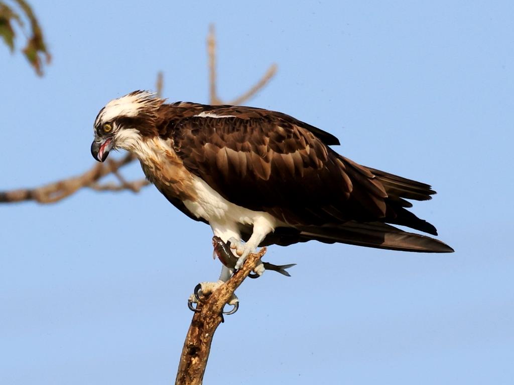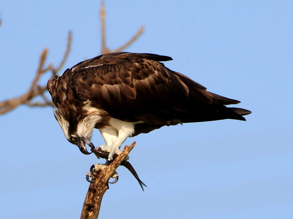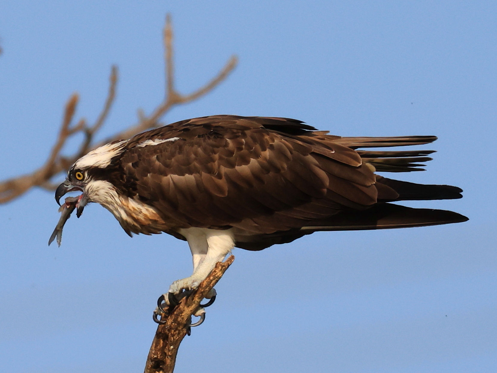 枝止まり作品は、鮎?の頭を食べている場面は、魚の発色が目立ち、ミサゴの鋭い目が印象的です。