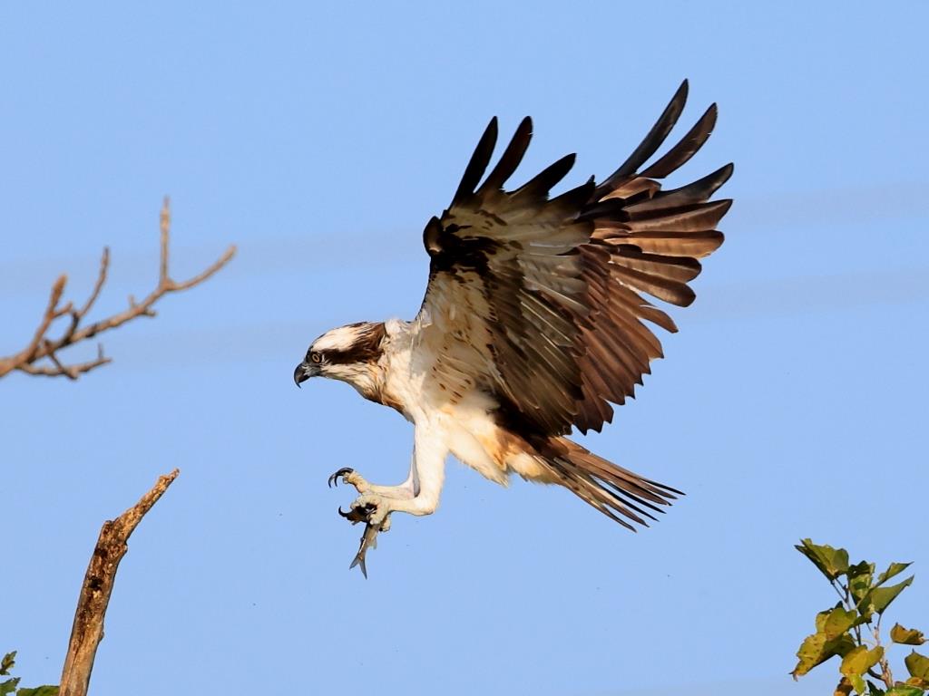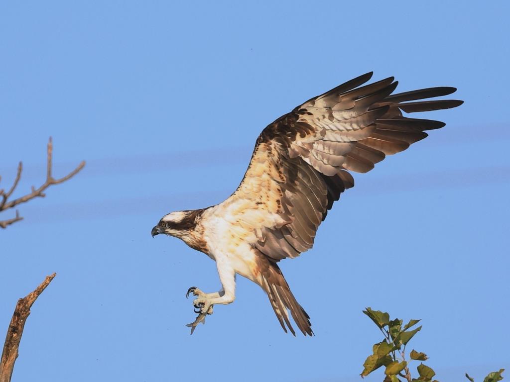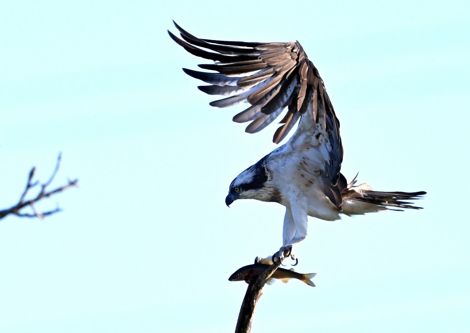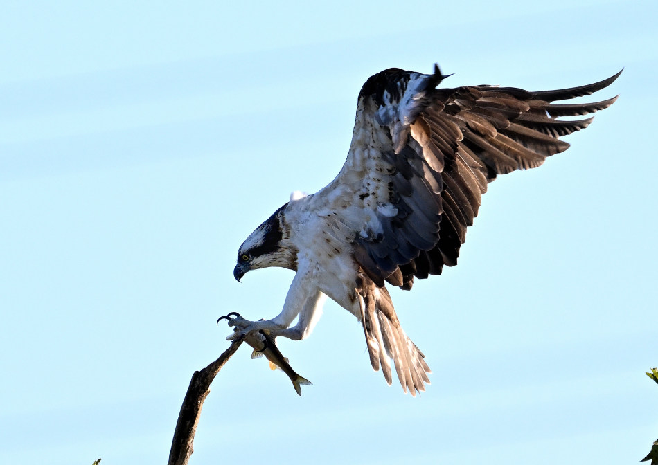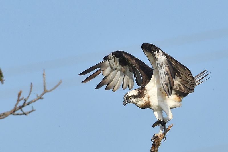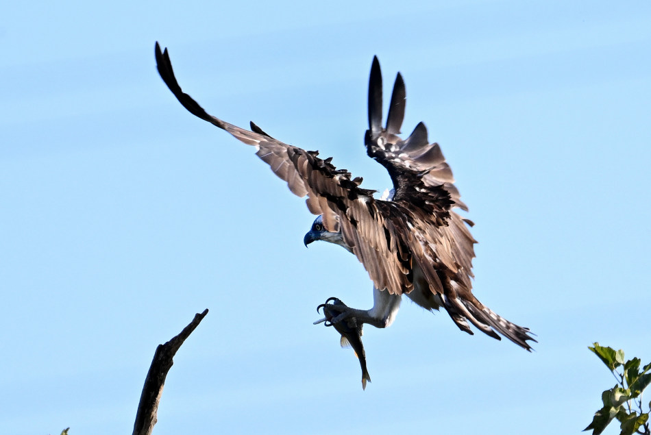 魚を持っての枝への飛び着き作品は、とても鮮明に連続撮影され青空バックでミサゴが引き立っています。