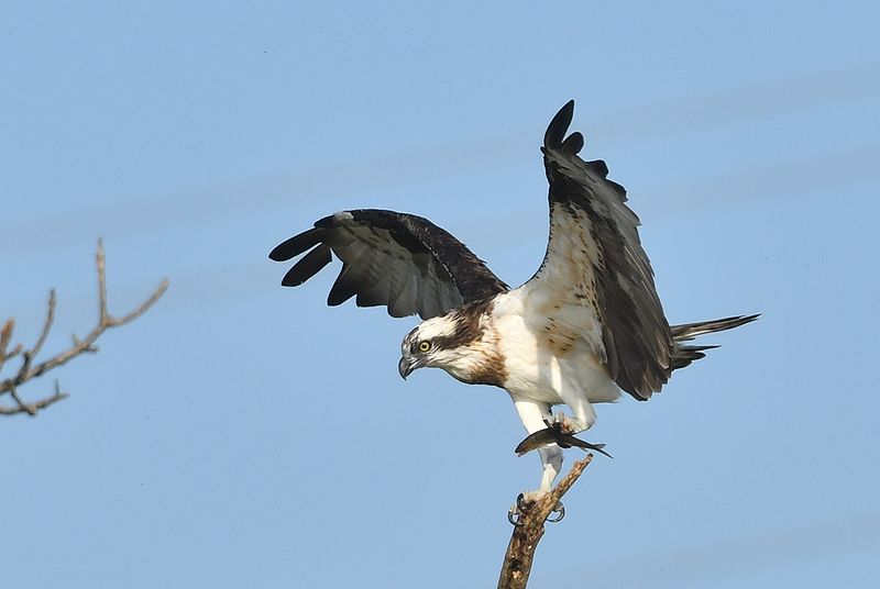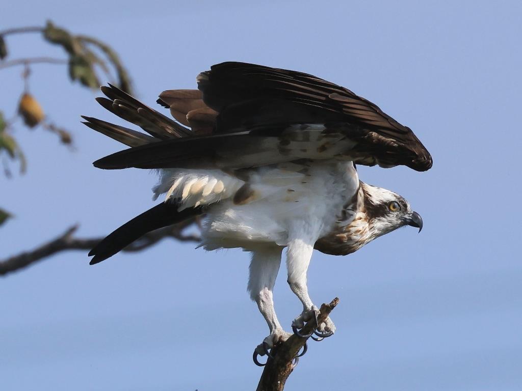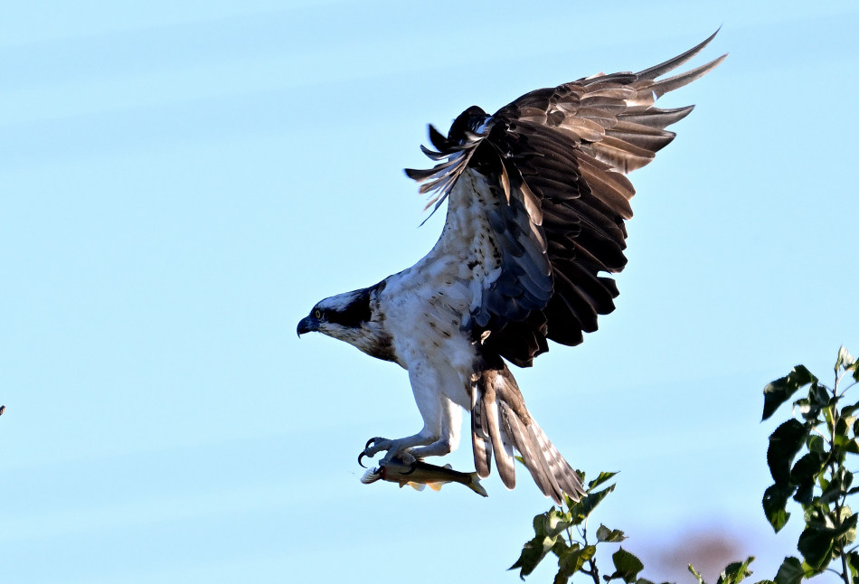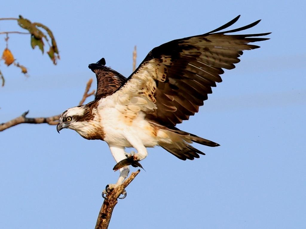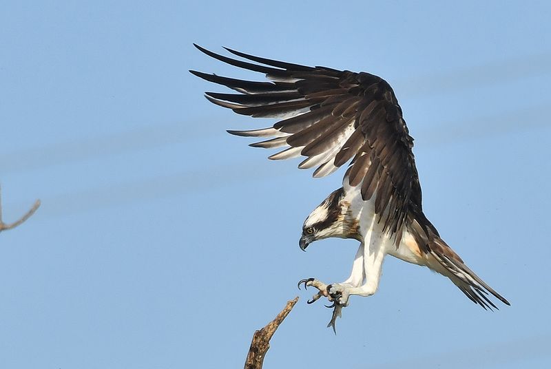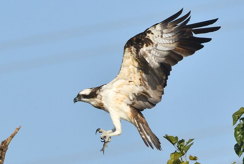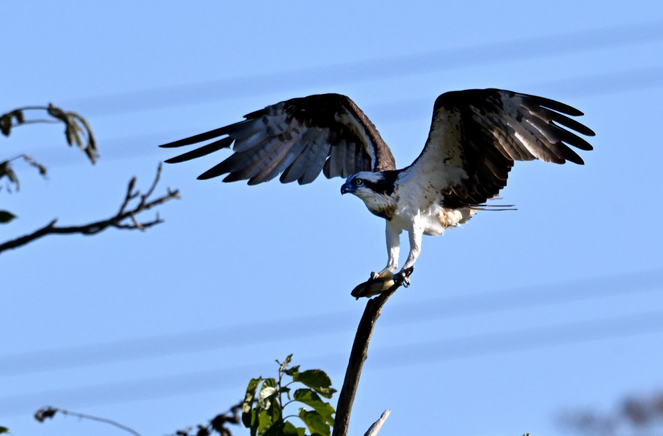 魚を持っての枝への飛び着き作品は、とても鮮明に連続撮影され青空バックでミサゴが引き立っています。