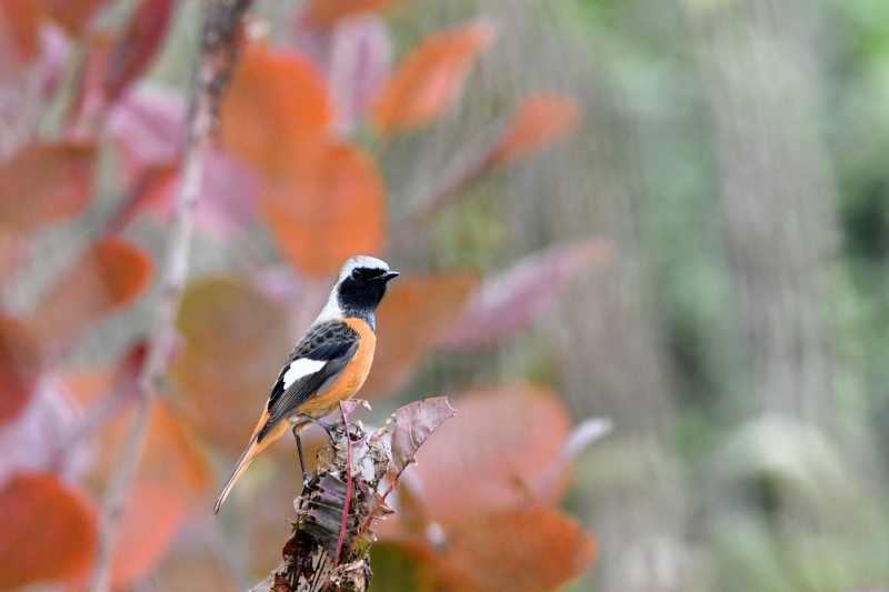 ジョウビタキ雄作品は、紅葉したバックの葉に止まった所を捉え、目に光が入り難い鳥ですがしっかり撮られ、晩秋らしい作品です。