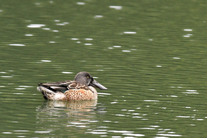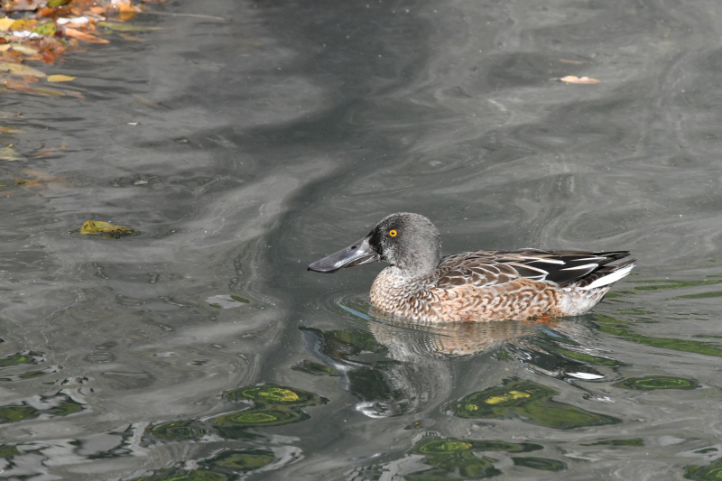 ハシビロガモ作品は、池で泳いでいる場面を撮られ、ごっつい目が印象的でカモの中では存在感のある鳥です。