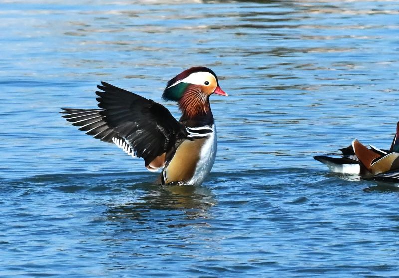 青空が水面に映えて10羽のオシドリが賑やかそうで、雄の色彩がとても綺麗な作品です。
