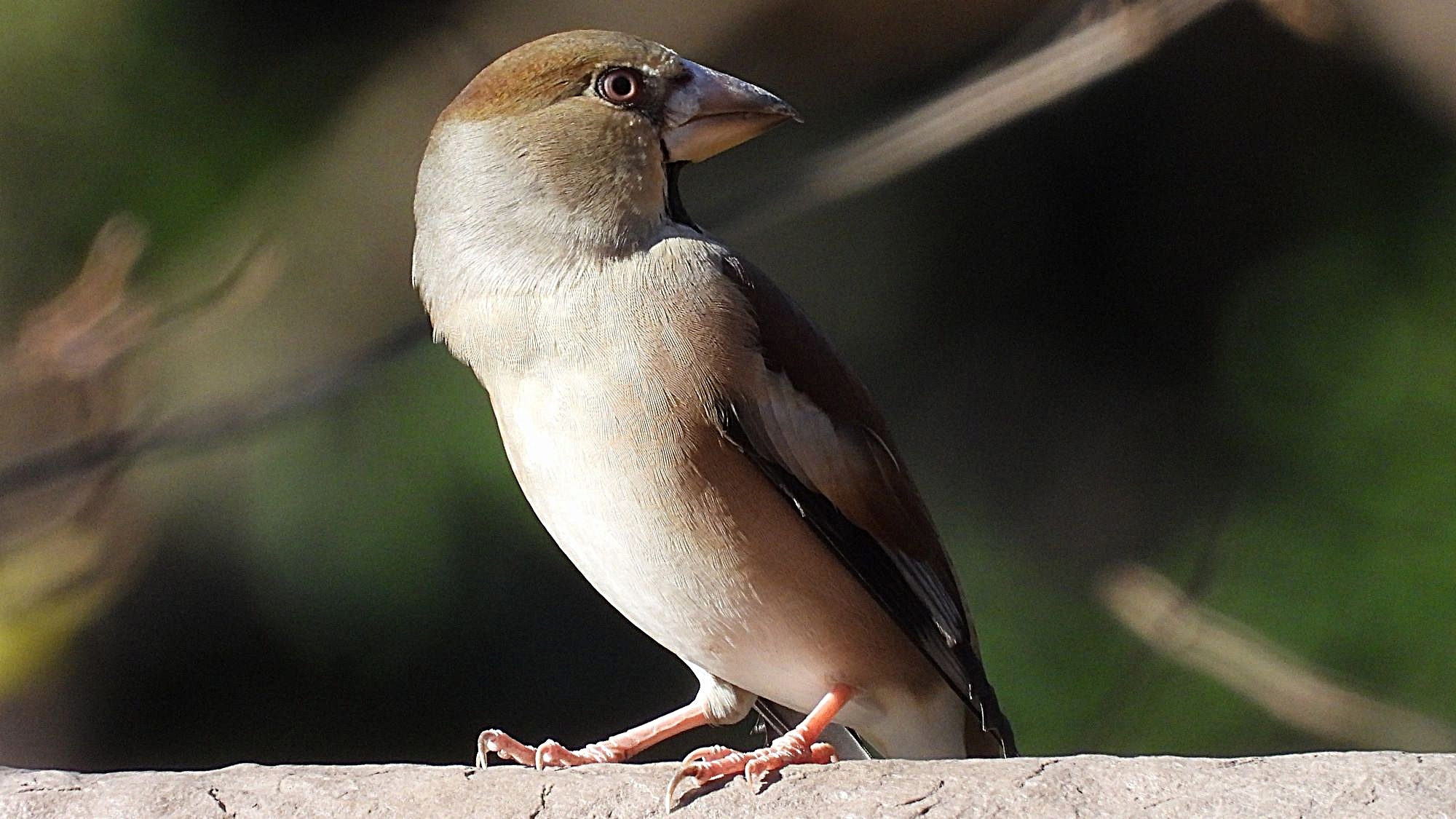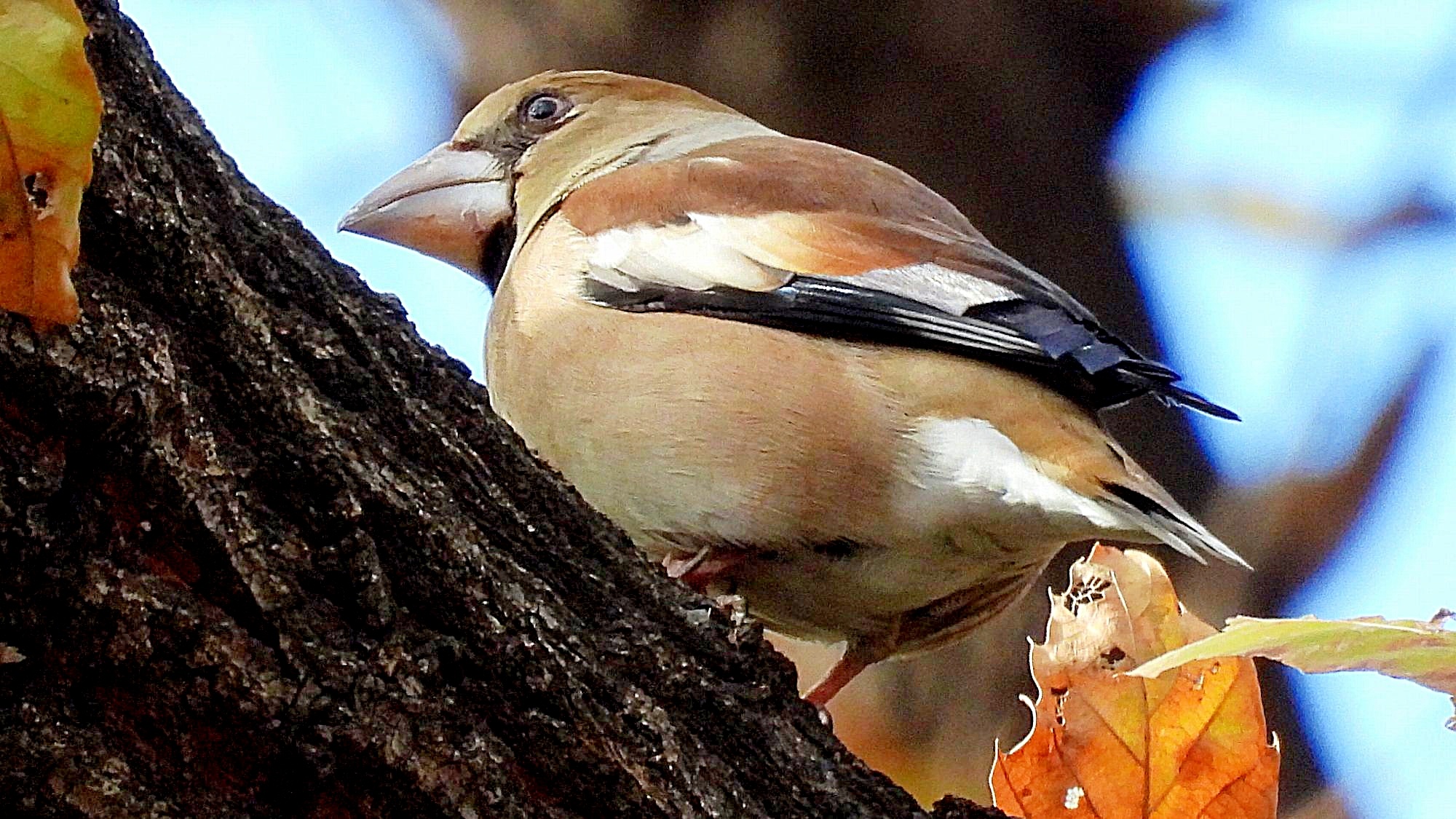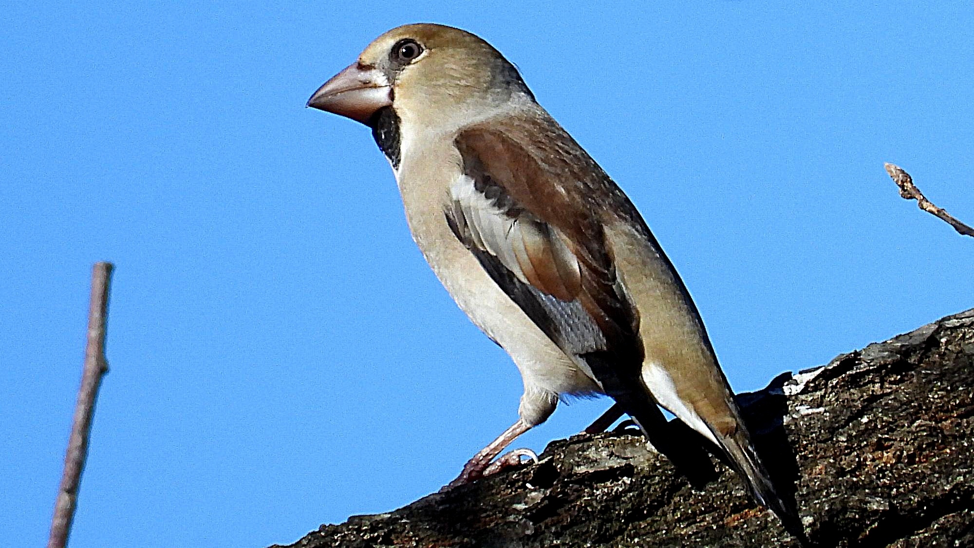 木の幹に止まったシメとツグミ作品は、目にしっかり光が入って鳥が引き立っています。