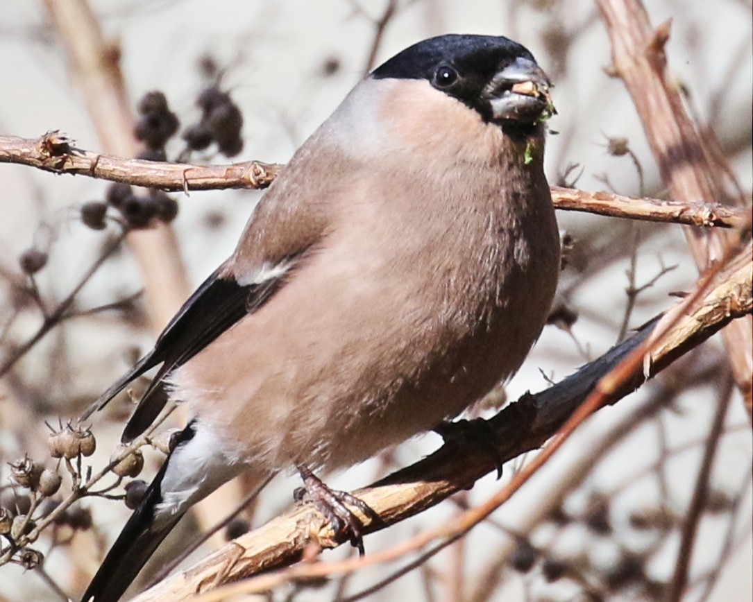 在庫の雄雌作品は、こちらは全身が見えるところの枝止まりで、雌が餌を口いっぱい咥えた場面を捉え、こちらも目にしっかり光が入って流石です。