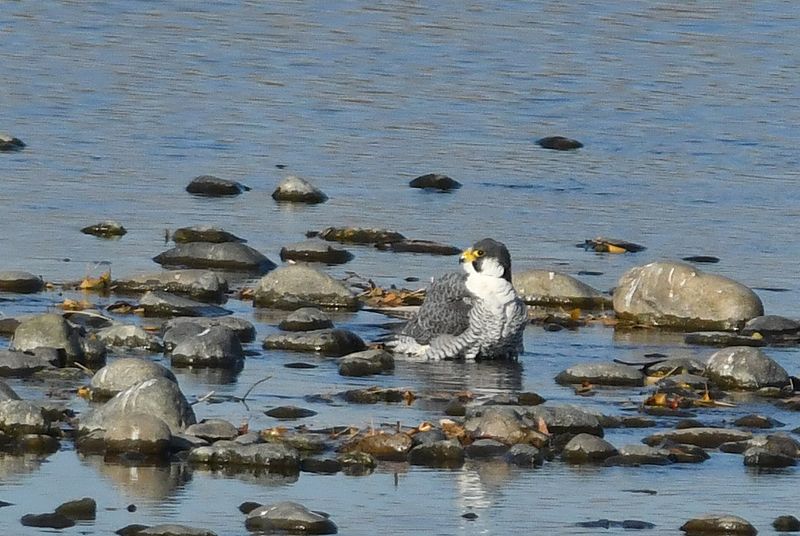 ママチャリで土手を下流方面に行ったのですが姿なく、再度上流に向かって走行していたら中州にハヤブサが水浴びをしていていました。