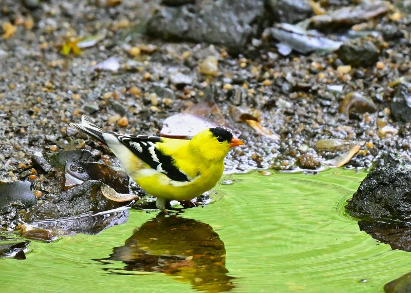 オウゴンヒワ作品は、水場に飛来した所を捉え、こちらも目に光が入って見応えがあります。