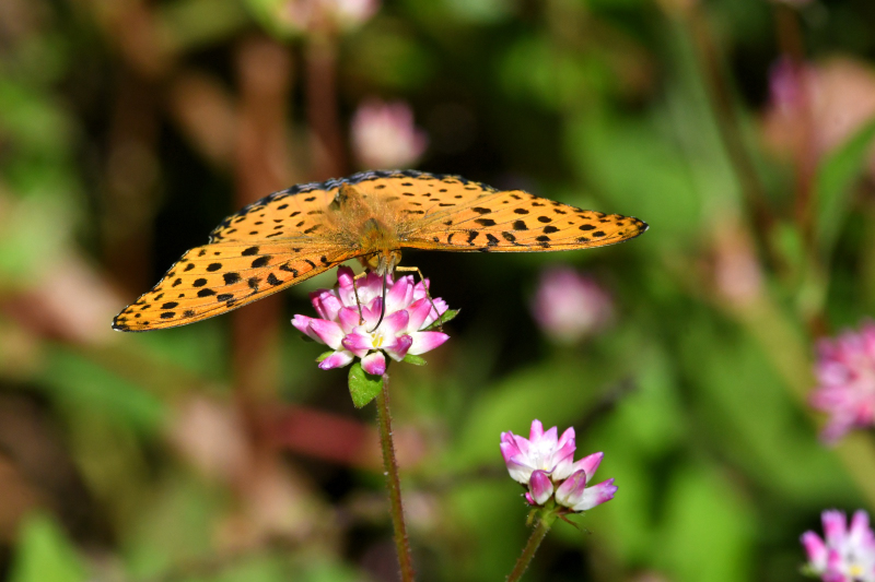 ミゾソバの花の蜜を吸いに飛来したツマグロヒョウモン♂作品は、とても小さくて可憐で色鮮やかな花に、ツマグロヒョウモン雄が止まって、綺麗な作品です。
