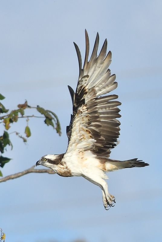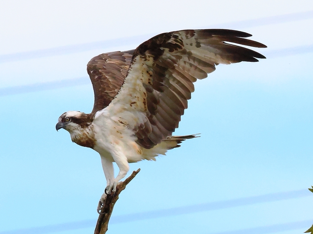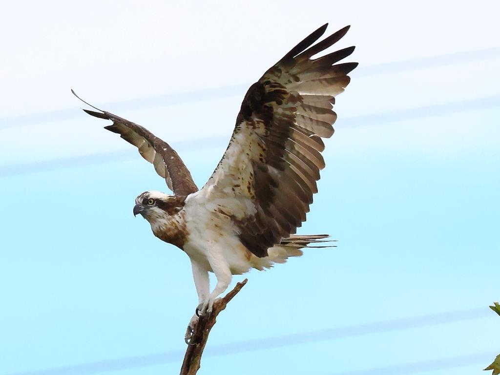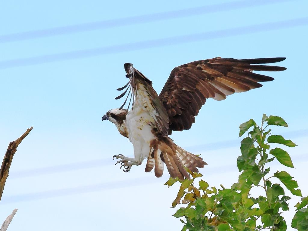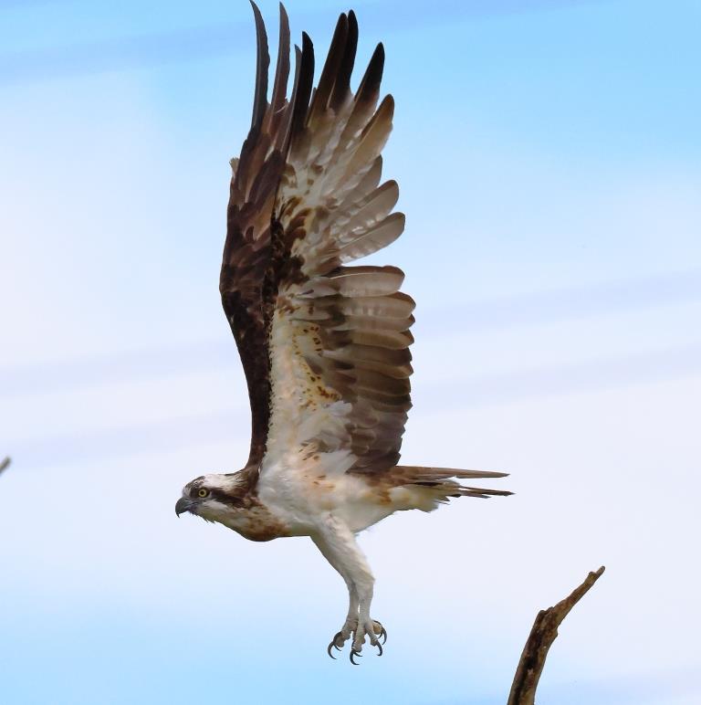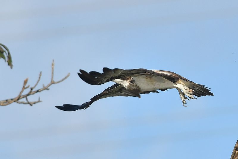 明るいバックの枝からの飛び出し、飛び出しを撮られミサゴが引き立っています。