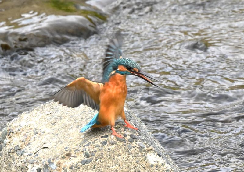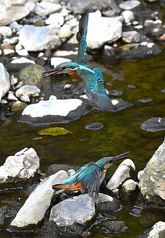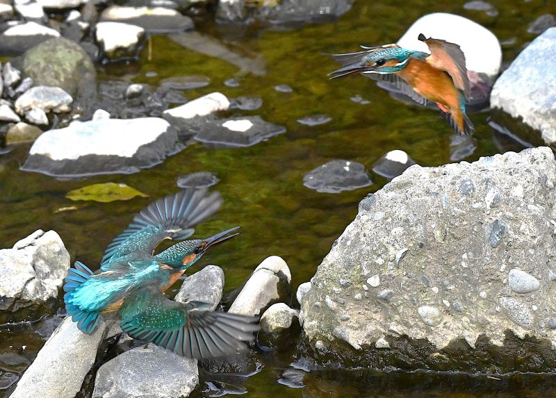 橋を挟んで上流のカワセミが、下流のカワセミの縄張りに侵入してくるので、争いが起こります。