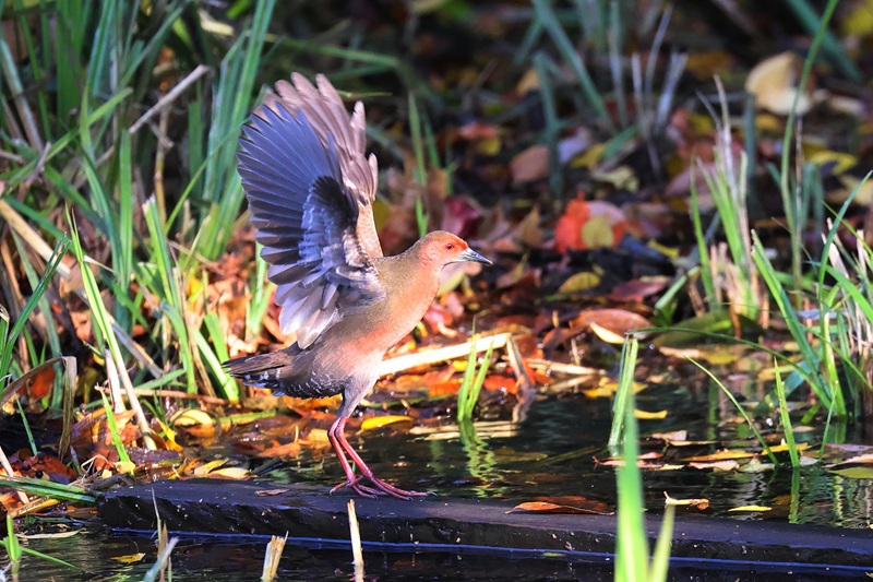 ヒクイナの水浴び後の羽ばたき撮れました。