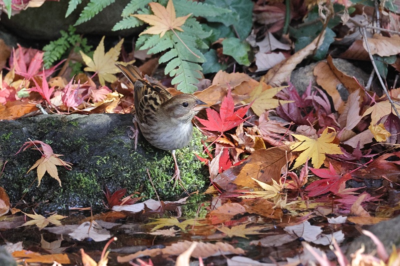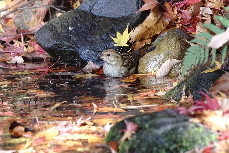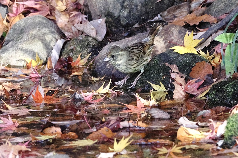 公園の小さな池に水飲みに来る鳥さんです。沢山の落ち葉が有り池は華やかです。