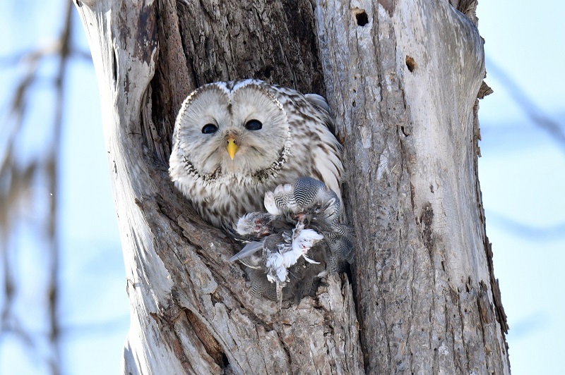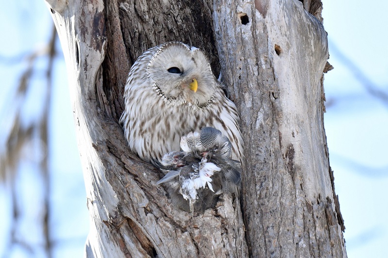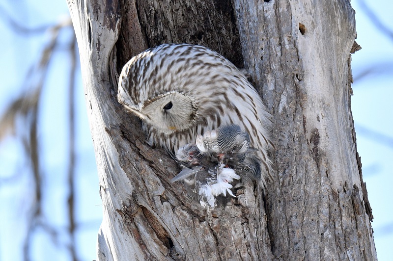 フクロウ行ってみたら違う洞に居て足元には、鳥の羽が見える
