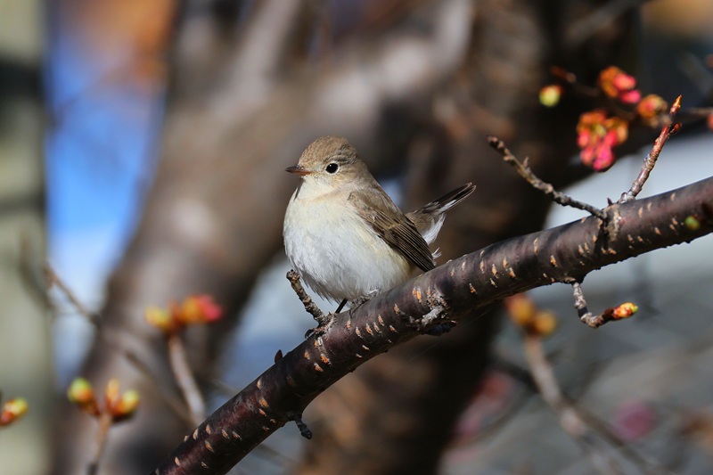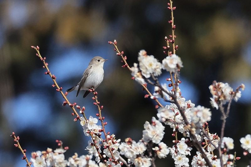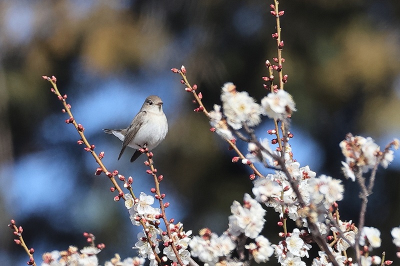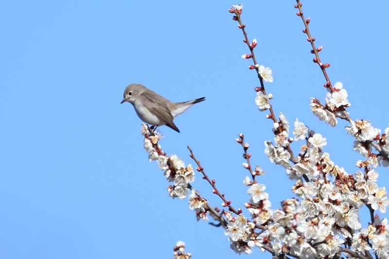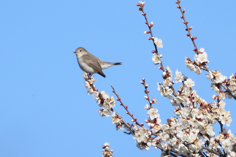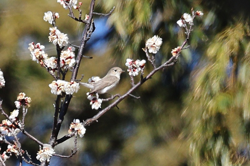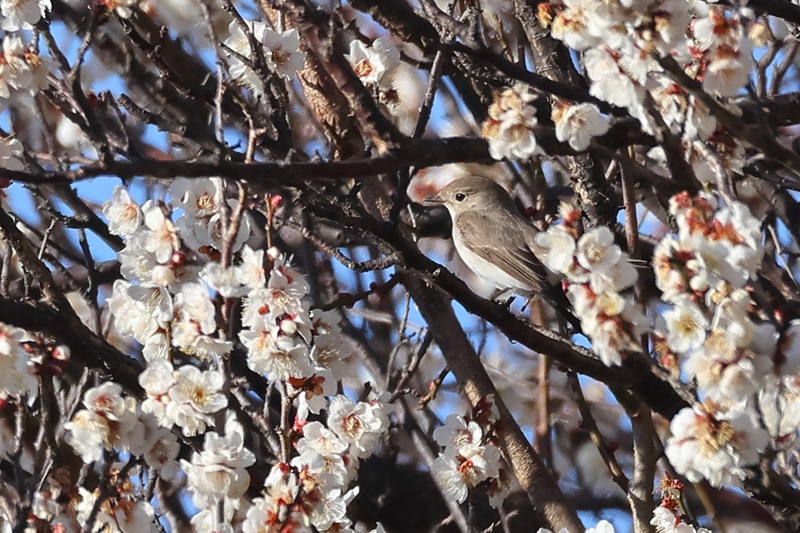 白梅の中心部は枝が密集してどこにニシオジロビタキ居るの?状態です。
