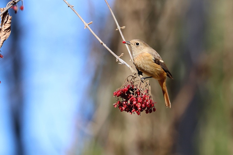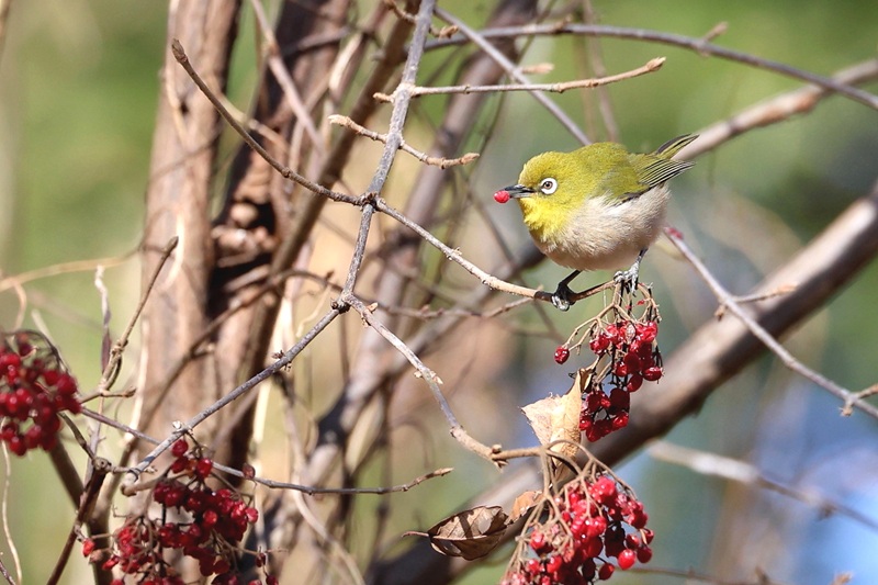 ジョウビタキ♀、メジロは赤い木の実を食べていました。