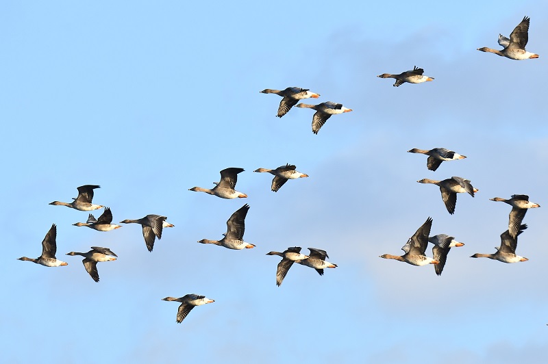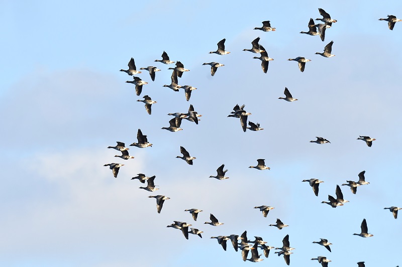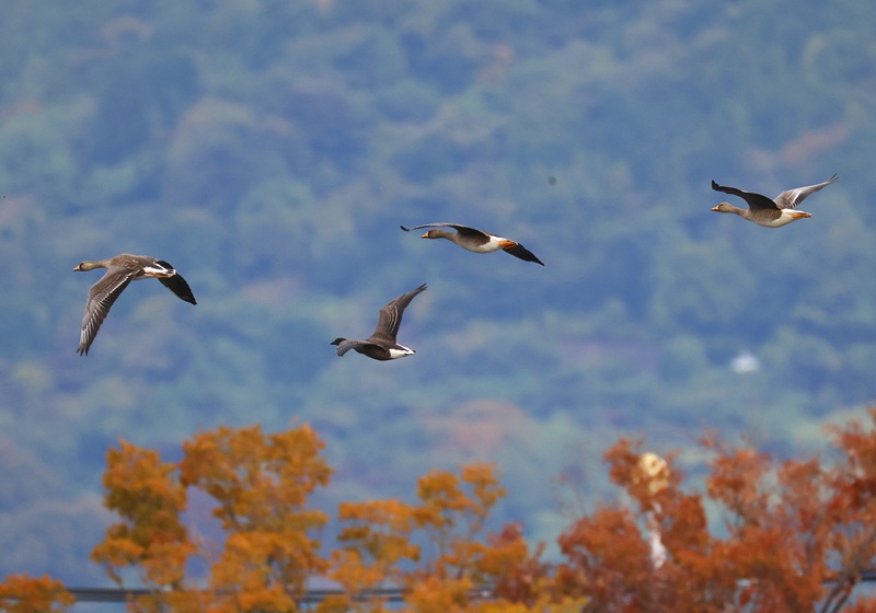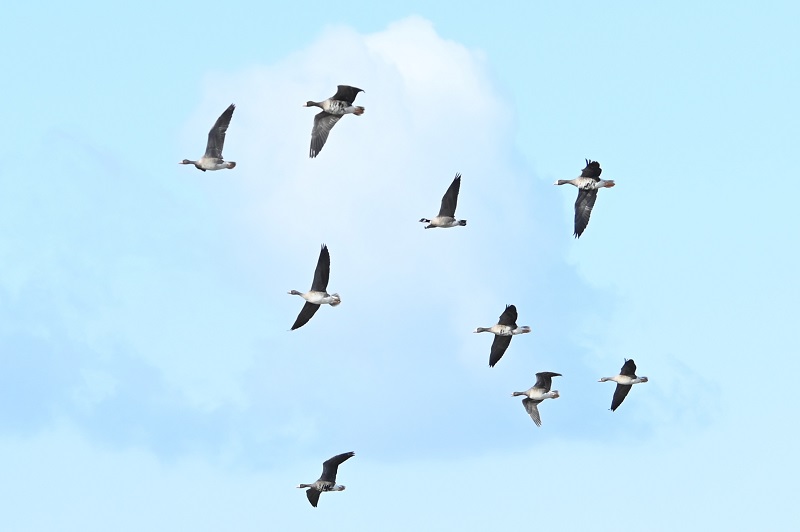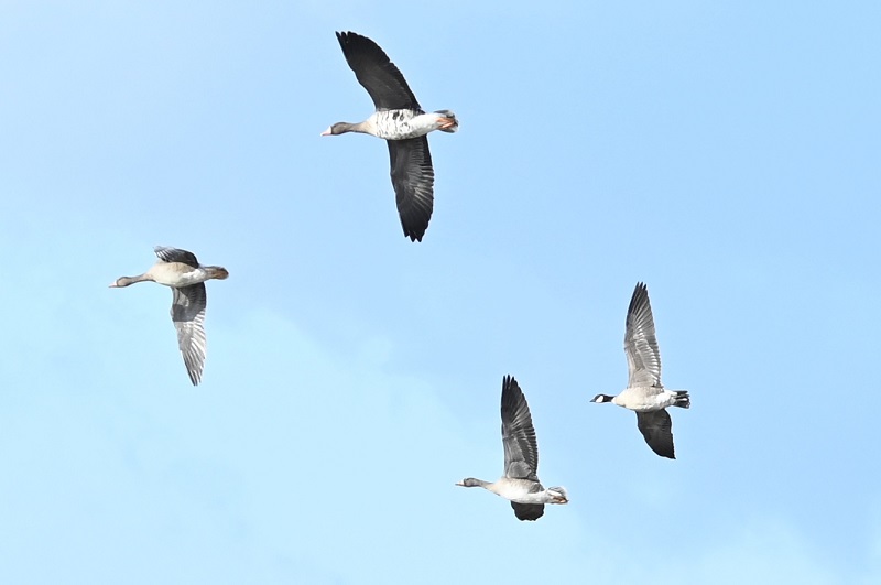 マガンの中に1羽のシジュウカラガンが一緒に飛んでました