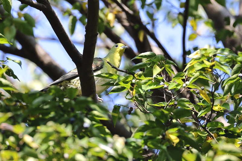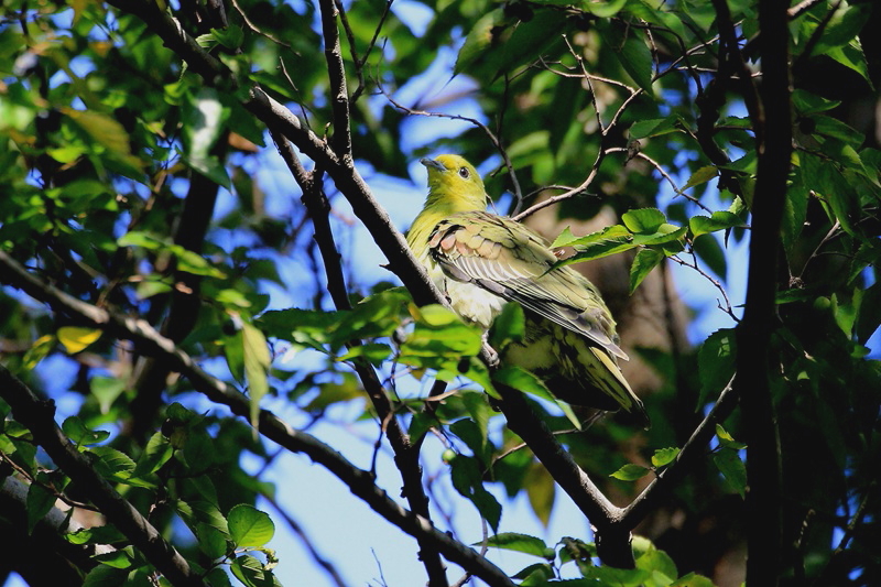 高い木の上でしかも葉と同化しアオバトが見えにくいです。