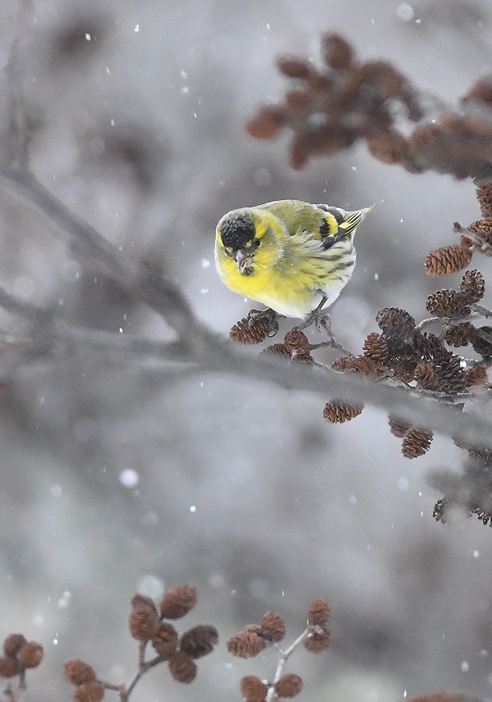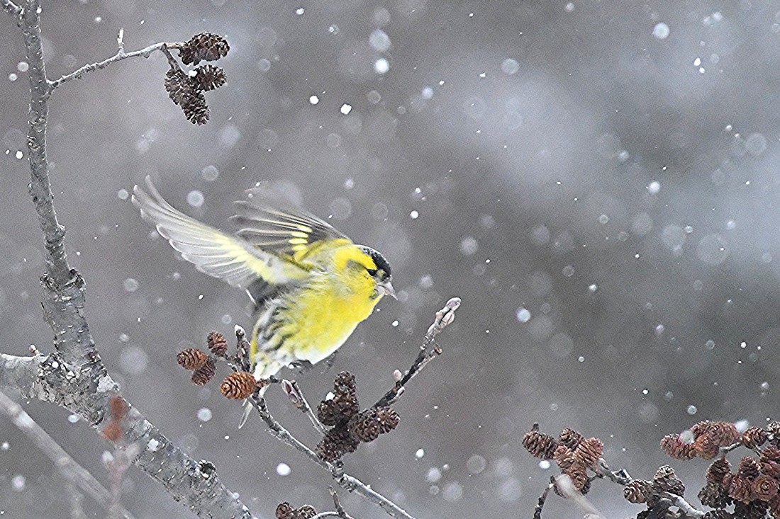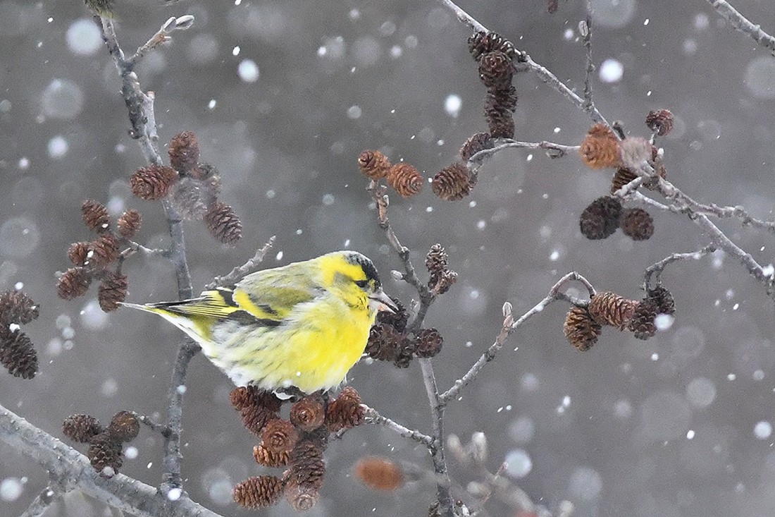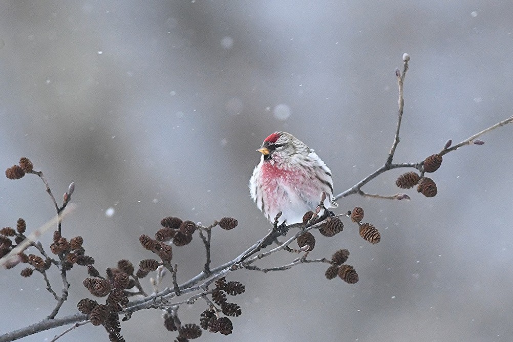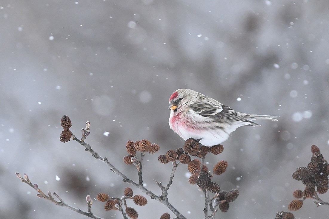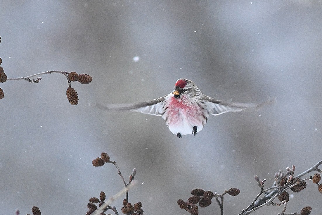 大雪の日にベニヒワの群れと一緒に飛んで来た