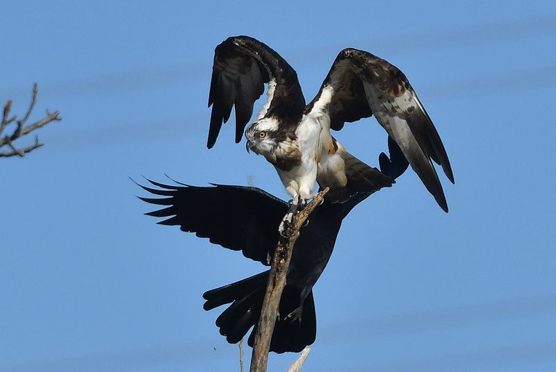 何時もミサゴは1日の大半を枝に止まって居るのですが、今日は何時もの枝に止まらず、大分待たされて約100m先の大木の枝に止まりました。