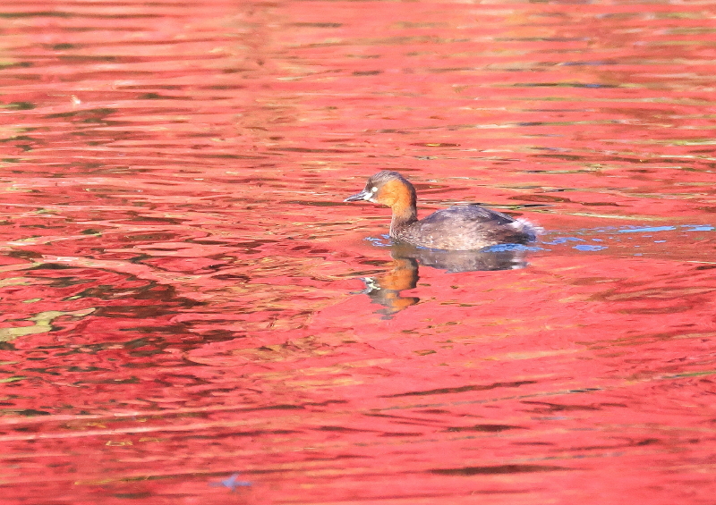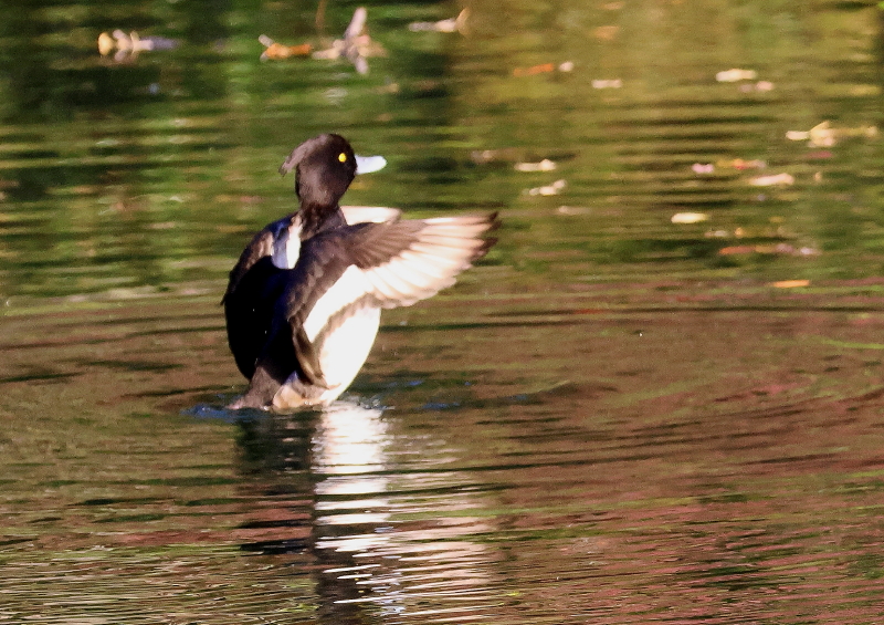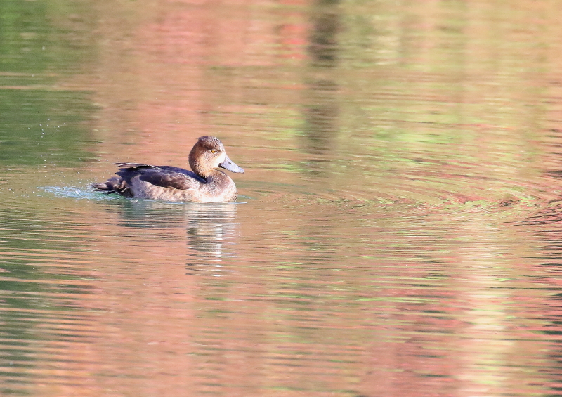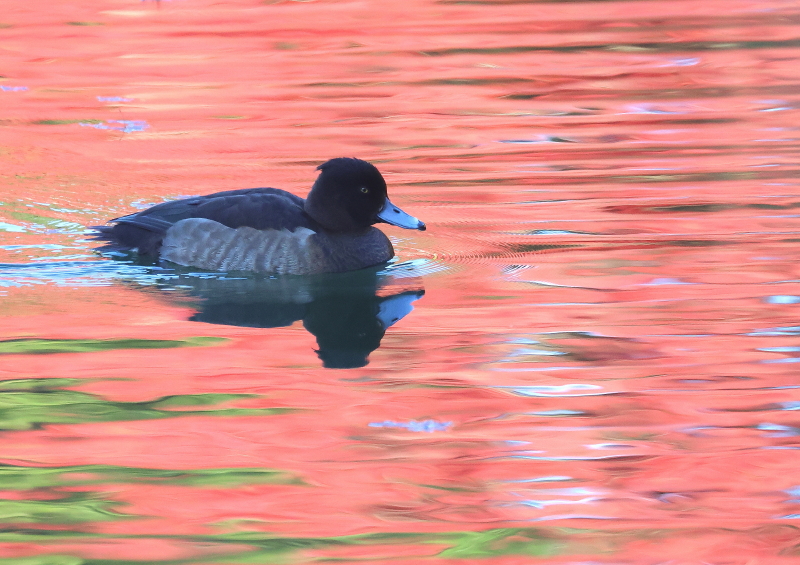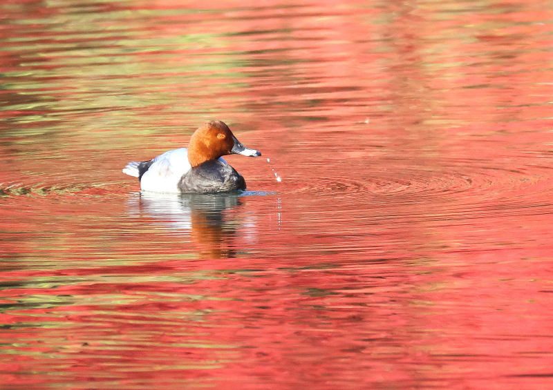 見事な紅葉の池の水面への映り込みに、ホシハジロ雄、キンクロハジロ雄・雌、カイツブリが映えていました。