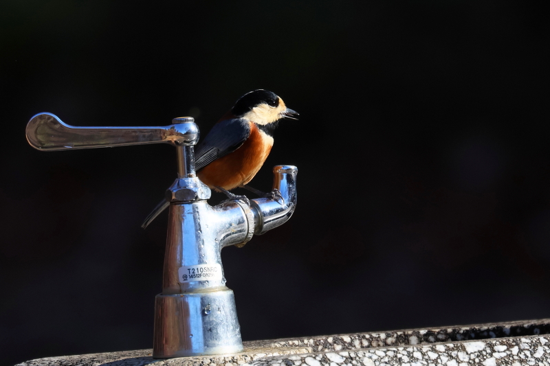 水道の蛇口に止まったヤマガラ、可愛いですね。