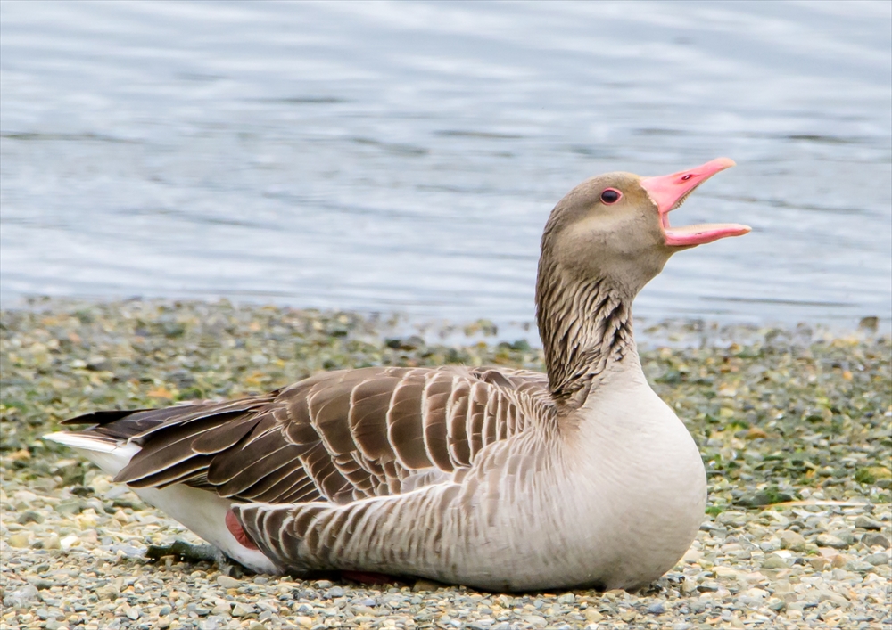 dosmanさん、こんばんは。大きな池のある公園に行ってきました。ハイイロガンがいました。図鑑では、嘴、足、アイリングがピンク色となっていますが、