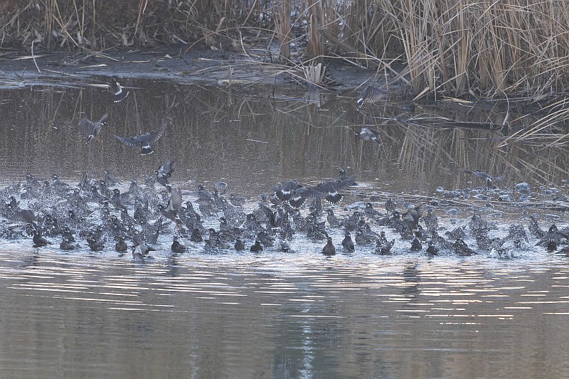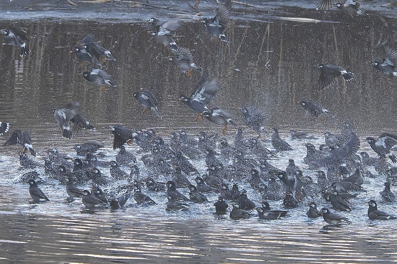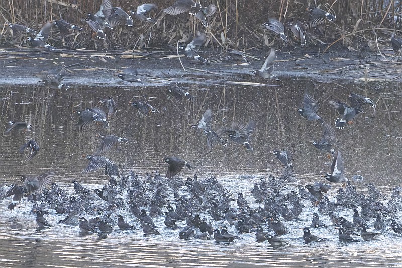 北の遊水池にて、日没直前になってムクドリの大群が水浴びに降りてきました。