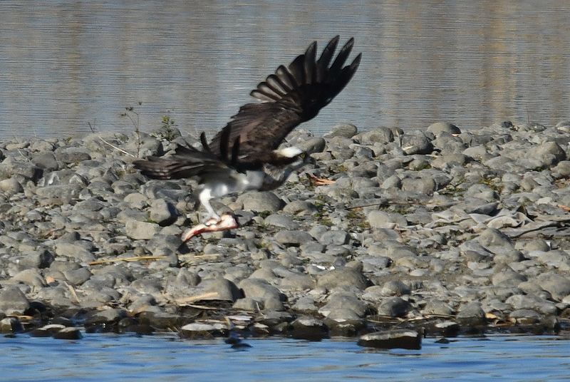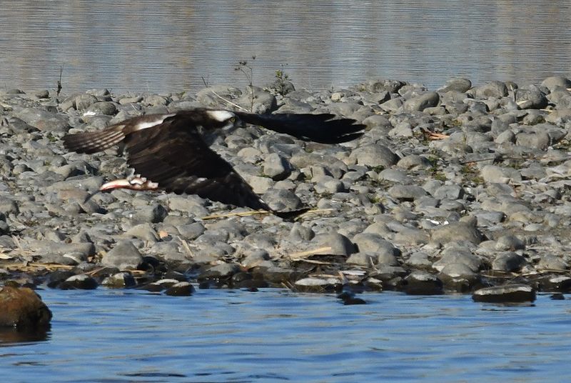 朝、土手をママチャリで走行し始めたら中州の岩で、ミサゴ雌が大きな鯉を捕まえて食べ始めていました。
