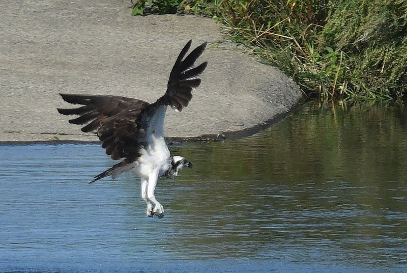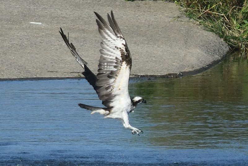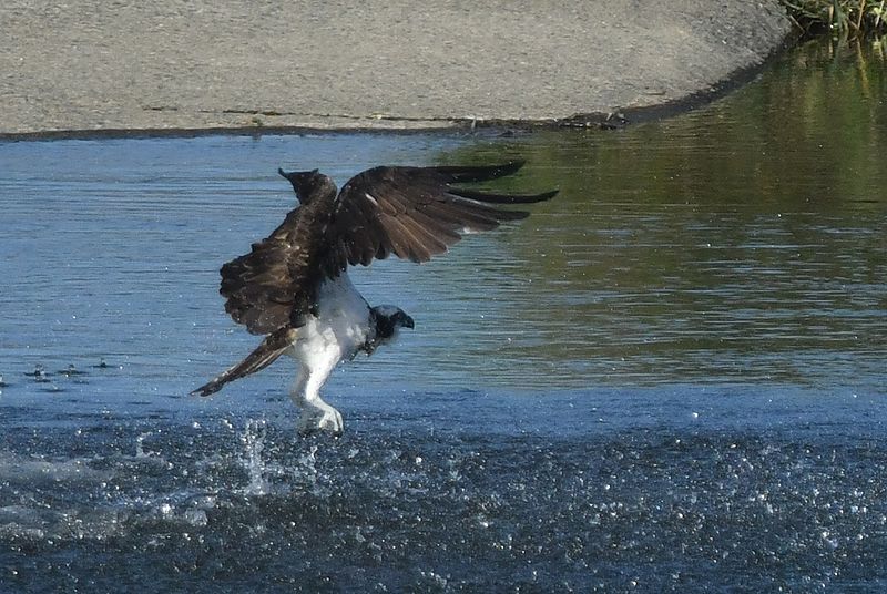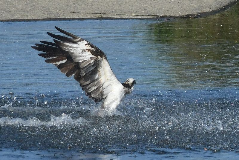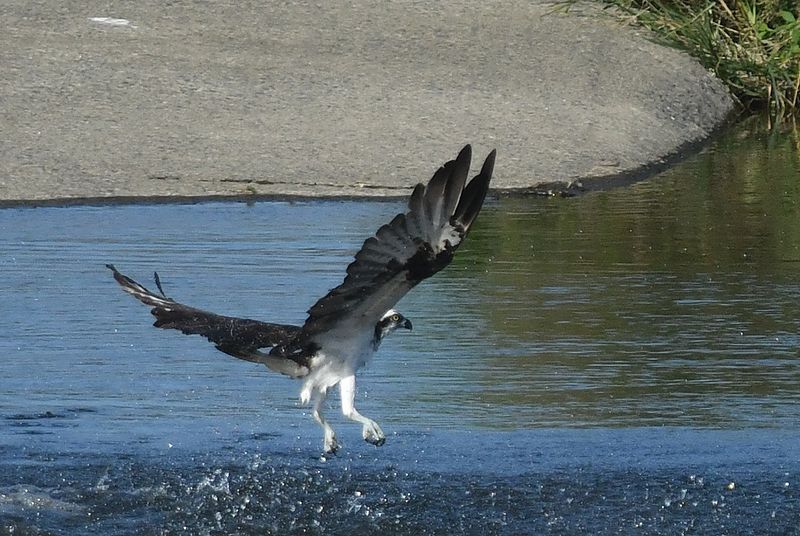 9時前にミサゴポイントに着いたら、上流からミサゴが飛来してくるのが見え、慌ててカメラとレンズを出して三脚にセットしたら、川に飛び込んでしまい、ダウィンは撮れず、辛うじて川に飛び込んだ瞬間から飛び出しまでは撮れましたが、鮎は掴めず、約500m上流で川に飛び込んで鮎を掴んで飛び去りました。