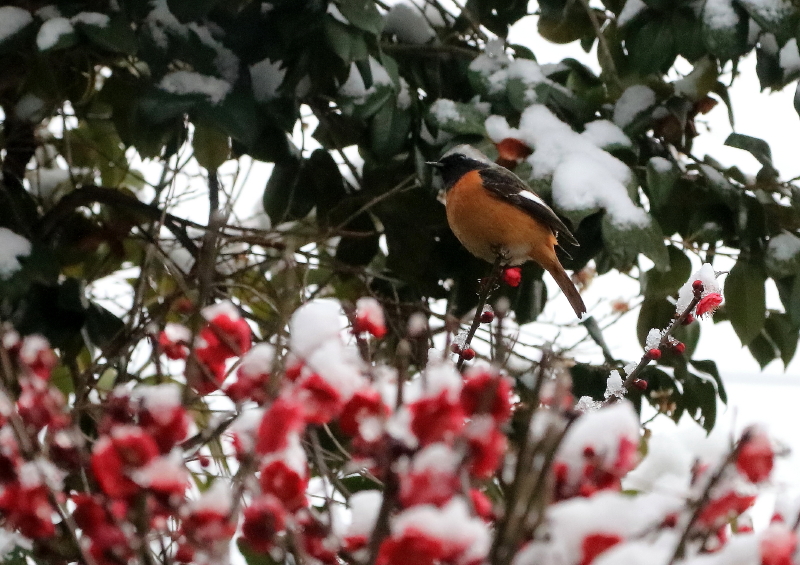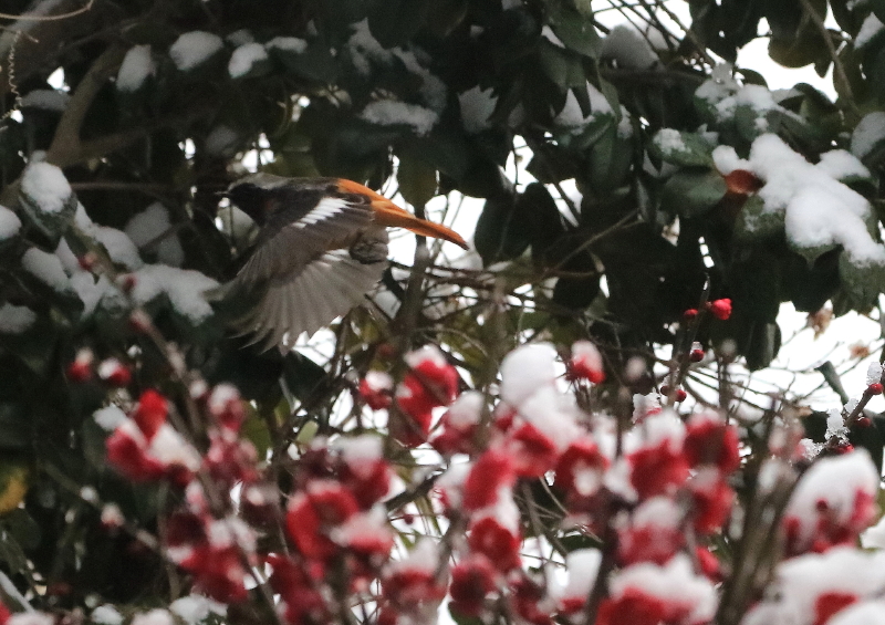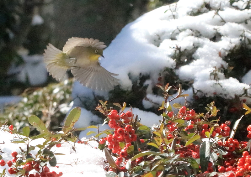 そして紅梅やピラカンサに来てくれたメジロ、見事な雪絡みですね。